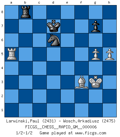 Last move : 1/2-1/2 2020 July 12 13:11:42 [Event "FICGS__CHESS__RAPID_GM__000006"] [Site "FICGS"] [Date "2020.05.12"] [Round "1"] [White "Larwinski,Paul"] [Black "Wosch,Arkadiusz"] [Result "1/2-1/2"] [WhiteElo "2431"] [BlackElo "2475"] 1.d4 Nf6 2.c4 e6 3.Nf3 d5 4.g3 dxc4 5.Bg2 Bd7 6.Ne5 Bc6 7.Nxc6 Nxc6 8.O-O Qd7 9.e3 O-O-O 10.Nd2 e5 11.Nxc4 exd4 12.Qa4 Qe6 13.Na5 Nxa5 14.Qxa5 Kb8 15.exd4 Nd5 16.a3 Qb6 17.Qe1 c6 18.b4 h5 19.h4 Bd6 20.Rb1 Qb5 21.Bd2 Rhe8 22.Qd1 Nb6 23.d5 cxd5 24.Qxh5 Qe2 25.Qxe2 Rxe2 26.Rfd1 Nc4 27.Bc3 Be5 28.Bxe5+ Rxe5 29.Rd3 d4 30.Rbd1 Re7 31.Rxd4 Rxd4 32.Rxd4 Nxa3 33.h5 Kc7 34.g4 f6 35.f4 Nb5 36.Rd5 Nd6 37.Kf2 Re8 38.Bf3 Kd7 39.g5 fxg5 40.fxg5 b6 41.Kg3 a6 42.Rd1 a5 43.bxa5 bxa5 44.Rd5 Rb8 45.Rxa5 1/2-1/2 Queen's pawn game Kingside Castling by player White (move 8) Queenside Castling by player Black (move 9) 10 pieces endgame at move 43 : White KRBPP , Black KRNPP WHITE : King + 1 Rook 1 Bishop 2 Pawns BLACK : King + 1 Rook 1 Knight 2 Pawns 9 pieces endgame at move 45 : White KRBPP , Black KRNP WHITE : King + 1 Rook 1 Bishop 2 Pawns BLACK : King + 1 Rook 1 Knight 1 Pawn This chess game ended in a draw. Follow this game move after move (download)Suddenly it was obvious to me in my analysis I had missed what Fischer had found with the greatest of ease at the board. (Mikhail Botvinnik) Intelligenz läßt sich nicht am Weg, sondern nur am Ergebnis feststellen. (Garry Kasparov) Si tu oponente no puede hacer nada activo, entonces no apures la posición; En vez de eso, dejalo estar sentado ahí, sufriendo y rogandote por un empate. (Jeremy Silman) Les pièces de l'échiquier étaient impitoyables. Elles le retenaient, elles l'absorbaient. Il y avait de l'horreur en cela, mais aussi une harmonie unique. Car, qu'y a-t-il dans le monde, à part les échecs ? (V. Nabokov) You have to believe in yourself. (Sun Tzu)