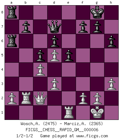 Last move : 1/2-1/2 2020 July 4 13:51:12 [Event "FICGS__CHESS__RAPID_GM__000006"] [Site "FICGS"] [Date "2020.05.12"] [Round "1"] [White "Wosch,Arkadiusz"] [Black "Marciz,Alexander"] [Result "1/2-1/2"] [WhiteElo "2475"] [BlackElo "2365"] 1.e4 e5 2.Nf3 Nc6 3.Bc4 Nf6 4.d3 Bc5 5.c3 d6 6.O-O O-O 7.Bb3 h6 8.Re1 a5 9.Nbd2 Be6 10.Nf1 Bxb3 11.Qxb3 Qd7 12.Be3 a4 13.Qc2 Rfe8 14.h3 Bxe3 15.Nxe3 Ne7 16.c4 c5 17.Reb1 Nc6 18.Qd2 Ra6 19.Nd5 Nxd5 20.exd5 Nb4 21.Ne1 a3 22.Nc2 axb2 23.Rxb2 Nxc2 24.Qxc2 Rea8 25.Re1 1/2-1/2 Two knights defense (Modern Bishop's Opening) Kingside Castling by player White (move 6) Kingside Castling by player Black (move 6) This chess game ended in a draw. Follow this game move after move (download)The passion for playing Chess is one of the most unaccountable in the world. (H.G. Wells) Bis zum Jahr 1971 verlief in meiner Schachkariere alles glatt. Dieses dramatische Match [Fischer-Taimanov 6:0] machte mein Leben zur Hölle. (Mark Taimanov) El juego del Ajedrez no es solamente una diversión quieta; algunas cualidades muy valuables de la mente se pueden adquirir y cultivar con el, como convertirlos en habitos disponibles para toda ocasión; ya que la vida es algo así como el Ajedrez. (Benjamin Franklin) Votre seul travail dans les ouvertures est d'obtenir un milieu de partie jouable. (Lajos Portish) Imagination is more important than knowledge. Knowledge is limited. Imagination encircles the world. (Albert Einstein)