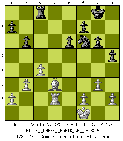Last move : 1/2-1/2 2020 July 4 0:8:6 [Event "FICGS__CHESS__RAPID_GM__000006"] [Site "FICGS"] [Date "2020.05.12"] [Round "1"] [White "Bernal Varela,Nelson"] [Black "Ortiz,Clodomiro"] [Result "1/2-1/2"] [WhiteElo "2503"] [BlackElo "2519"] 1.Nf3 Nf6 2.c4 e6 3.d4 b6 4.g3 Ba6 5.b3 Bb4+ 6.Bd2 Be7 7.Bg2 c6 8.Bc3 d5 9.O-O O-O 10.Nbd2 Nbd7 11.Re1 Bb7 12.Bb2 Rc8 13.e4 dxe4 14.Nxe4 c5 15.Nfg5 Bxe4 16.Nxe4 Nxe4 17.Rxe4 Bf6 18.Re2 Qc7 19.Rd2 Rfd8 20.Qe1 cxd4 21.Bxd4 Bxd4 22.Rxd4 Nf6 23.Rad1 Rxd4 24.Rxd4 g6 25.Bf1 Qc5 26.Qa1 h5 27.Rd1 Qf5 28.Bd3 Qf3 29.Rd2 Ng4 30.Qd4 Qf6 31.Qxf6 Nxf6 32.Kf1 1/2-1/2 Reti Opening Kingside Castling by player White (move 9) Kingside Castling by player Black (move 9) This chess game ended in a draw. Follow this game move after move (download)In blitz, the Knight is stronger than the Bishop. (Vlastimil Hort) Ich spiele ehrlich und spiele, um zu gewinnen. Wenn ich verliere nehme ich meine Medizin. (Robert James Fischer) El Ajedrez detiene a su maestro dentro de sus propios vínculos, encadenando la mente y el cerebro, por lo que la libertad interior del mas fuerte debe sufrir. (Albert Einstein) Il s'avisa de me proposer d'apprendre les échecs qu'il jouait un peu... me voilà forcené des échecs. J'achète un échiquier, je m'enferme dans ma chambre, j'y passe des jours et des nuits à vouloir apprendre par cur toutes les parties. (Jean-Jacques Rousseau, Confessions) Knowledge will give you power, but character respect. (Bruce Lee)