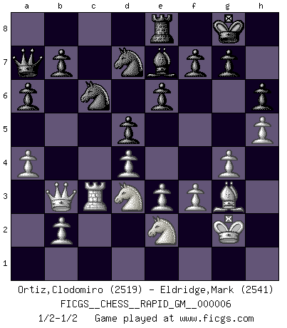 Last move : 1/2-1/2 2020 September 28 15:36:32 [Event "FICGS__CHESS__RAPID_GM__000006"] [Site "FICGS"] [Date "2020.05.12"] [Round "1"] [White "Ortiz,Clodomiro"] [Black "Eldridge,Mark"] [Result "1/2-1/2"] [WhiteElo "2519"] [BlackElo "2541"] 1.d4 d5 2.c4 c6 3.cxd5 cxd5 4.Nc3 Nf6 5.Bf4 Nc6 6.e3 a6 7.Bd3 Bg4 8.Nge2 e6 9.Rc1 Be7 10.O-O Bh5 11.Na4 Bg6 12.h3 Rc8 13.Nc5 Qb6 14.Rc3 Qa7 15.Qb3 Bxd3 16.Nxd3 Nd7 17.Rfc1 O-O 18.Qd1 Rfe8 19.g4 Qa8 20.Kg2 Na7 21.Rc7 Red8 22.h4 Rxc7 23.Rxc7 Nb5 24.Rc1 Rc8 25.a4 Na7 26.Nc3 Nc6 27.h5 h6 28.Na2 Na5 29.Qe1 Nc6 30.Qd1 Na5 31.Bg3 Nf6 32.Qe1 Nc6 33.f3 Nd7 34.Qd2 Bg5 35.Bf4 Be7 36.Nc3 Re8 37.Ne2 Rf8 38.Bg3 Qa7 39.Qe1 Qb6 40.Rc3 Rd8 41.Qd1 Qa7 42.Kh3 Rc8 43.Bh4 Bd6 44.Kg2 Re8 45.Bg3 Be7 46.Kh3 Qb6 47.Kg2 Qd8 48.Rc1 Bg5 49.Bf4 Be7 50.Kh3 Qb6 51.Rc3 Qd8 52.Kg2 Qa8 53.Bg3 Rc8 54.Be1 Nb6 55.Bf2 Nd7 56.Qc2 Re8 57.Qd1 Qd8 58.Bg3 Nb6 59.Kh3 Nd7 60.Kg2 Qb6 61.Qb3 Qa7 1/2-1/2 QGD Slav defense : Exchange variation Kingside Castling by player White (move 10) Kingside Castling by player Black (move 17) This chess game ended in a draw. Follow this game move after move (download)If Chess is a science, it's a most inexact one. If Chess is an art, it is too exacting to be seen as one. If Chess is a sport, it's too esoteric. If Chess is a game, it's too demanding to be just a game. If Chess is a mistress, she's a demanding one. If Chess is a passion, it's a rewarding one. If Chess is life, it's a sad one. (Unknown) Schach ist das schnellste Spiel der Welt, weil man in jeder Sekunde Tausende von Gedanken ordnen muß. (Albert Einstein) Solo puedes ser bueno en el Ajedrez si amas al juego. (Bobby Fischer) Il n'y a pas de prix trop élevé au scalp de l'ennemi. (Koblentz) All art requires courage. (Anne Tucker)