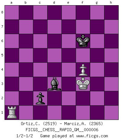 Last move : 1/2-1/2 2020 July 26 14:24:18 [Event "FICGS__CHESS__RAPID_GM__000006"] [Site "FICGS"] [Date "2020.05.12"] [Round "1"] [White "Ortiz,Clodomiro"] [Black "Marciz,Alexander"] [Result "1/2-1/2"] [WhiteElo "2519"] [BlackElo "2365"] 1.d4 d5 2.c4 c6 3.cxd5 cxd5 4.Nc3 Nc6 5.e4 e6 6.e5 Nge7 7.Nf3 Nf5 8.Bb5 Bd7 9.O-O Rc8 10.Kh1 h6 11.Ba4 Qb6 12.Ne2 Qa6 13.Bb3 Be7 14.Bd2 Na5 15.Bxa5 Qxa5 16.Bc2 Nh4 17.Ne1 O-O 18.g3 Ng6 19.h4 Rfe8 20.f4 Rc7 21.a3 Rec8 22.Nc3 Bd8 23.h5 Ne7 24.Rb1 Rc4 25.g4 Qa6 26.Nf3 Ba5 27.Bd3 Bxc3 28.bxc3 Qxa3 29.Bxc4 dxc4 30.Qd2 Nd5 31.Rbc1 Qe7 32.Ra1 b5 33.g5 hxg5 34.Nxg5 b4 35.Rxa7 bxc3 36.Qc2 f5 37.exf6 Nxf6 38.Kh2 Rb8 39.Qg6 Qe8 40.Rc1 Rb2+ 41.Kg1 Rd2 42.Qxe8+ Bxe8 43.Rxc3 Rxd4 44.Rxg7+ Kxg7 45.Nxe6+ Kh7 46.Nxd4 Nd5 47.Rf3 Bxh5 48.Rf1 c3 49.Kh2 Kg7 50.Kg3 Bg6 51.Kf3 c2 52.Ra1 Nb4 53.Nb3 Kf6 54.Nc1 Nd3 55.Nxd3 Bxd3 1/2-1/2 QGD Slav defense : Exchange variation Kingside Castling by player White (move 9) Kingside Castling by player Black (move 17) 10 pieces endgame at move 45 : White KRNPP , Black KRBNP WHITE : King + 1 Rook 1 Knight 2 Pawns BLACK : King + 1 Rook 1 Bishop 1 Knight 1 Pawn 9 pieces endgame at move 46 : White KRNPP , Black KBNP WHITE : King + 1 Rook 1 Knight 2 Pawns BLACK : King + 1 Bishop 1 Knight 1 Pawn 8 pieces endgame at move 47 : White KRNP , Black KBNP WHITE : King + 1 Rook 1 Knight 1 Pawn BLACK : King + 1 Bishop 1 Knight 1 Pawn 7 pieces endgame at move 55 : White KRNP , Black KBP WHITE : King + 1 Rook 1 Knight 1 Pawn BLACK : King + 1 Bishop 1 Pawn 6 pieces endgame at move 55 : White KRP , Black KBP WHITE : King + 1 Rook 1 Pawn BLACK : King + 1 Bishop 1 Pawn This chess game ended in a draw. Follow this game move after move (download)Discovered check is the dive bomber of the Chessboard. (Reuben Fine) Man kann eine Schachpartie nur gewinnen, wenn das Gleichgewicht gestört ist. In einer Stellung mit ungestörtem Gleichgewicht ist auch das größte Genie hilflos - in der Stellung steckt dann eben kein genialer Einfall. (Wilhelm Steinitz) Yo tuve un dolor de muelas en la primer partida. En el segundo juego, tuve un dolor de cabeza. En el tercero, tuve un ataque de reumatísmo. En la cuarta partida, no me sentía muy bien. ¿Y en el quinto juego? Bueno, ¿que acaso uno tiene que ganar todos los juegos?. (Siegbert Tarrasch) Même un GMI sait rarement calculer sur plus de cinq coups une attaque à sacrifices. (Rudolf Spielmann) Are you threatening me, Master Jedi ? (Chancellor Palpatine in Star Wars ep.3)