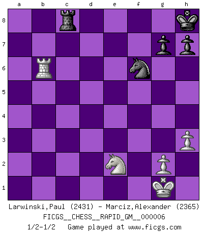 Last move : 1/2-1/2 2020 May 17 17:40:13 [Event "FICGS__CHESS__RAPID_GM__000006"] [Site "FICGS"] [Date "2020.05.12"] [Round "1"] [White "Larwinski,Paul"] [Black "Marciz,Alexander"] [Result "1/2-1/2"] [WhiteElo "2431"] [BlackElo "2365"] 1.e4 c5 2.Nf3 Nc6 3.d4 cxd4 4.Nxd4 Nf6 5.Nc3 e5 6.Ndb5 d6 7.Nd5 Nxd5 8.exd5 Nb8 9.c4 Be7 10.Be2 Nd7 11.O-O O-O 12.a3 b6 13.b4 f5 14.f3 a6 15.Nc3 Rb8 16.Rb1 Kh8 17.Be3 Bg5 18.Qd2 Bxe3+ 19.Qxe3 Qc7 20.Rbc1 Nf6 21.f4 Re8 22.fxe5 Rxe5 23.Qd4 Bd7 24.Bd3 Rbe8 25.Rc2 Ng4 26.Re2 Rc8 27.h3 Rxe2 28.Nxe2 Ne5 29.Bxf5 Bxf5 30.Rxf5 Qxc4 31.Qxc4 Nxc4 32.Rf7 Nxa3 33.Ra7 Nc2 34.Rxa6 Nxb4 35.Rxb6 Nxd5 36.Rxd6 Nf6 37.Rb6 1/2-1/2 Sicilian : Pelikan (Lasker/Sveshnikov) variation Kingside Castling by player White (move 11) Kingside Castling by player Black (move 11) 10 pieces endgame at move 36 : White KRNPP , Black KRNPP WHITE : King + 1 Rook 1 Knight 2 Pawns BLACK : King + 1 Rook 1 Knight 2 Pawns This chess game ended in a draw. Follow this game move after move (download)Fischer is the strongest player in the world. In fact, the strongest player who ever lived. (Larry Evans) Im Schach nämlich geht es darum, daß Ich des Gegners klein zu kriegen, sein Ego zu zerbrechen und zu zermahlen, seine Selbstachtung zu zertreten und zu verscharren und seine ganze mißachtenswerte sogenannte Persönlichkeit ein für alle Mal tot zu hacken und zu zerstampfen und dadurch die menschliche Gesellschaft von einer stinkenden Pestbeule zu befreien. Es ist ein königliches Spiel. (Robert James Fischer) Hoy en día, si tu no eres un Gran Maestro a los 14 años, es mejor que lo olvides. (Anand Viswanathan) La vérité est comme le meilleur coup aux échecs : elle existe, mais il faut la chercher. (Arturo Perez-Reverte) O divine art of subtlety and secrecy! Through you we learn to be invisible, through you inaudible and hence we can hold the enemy's fate in our hands. (Sun Tzu)