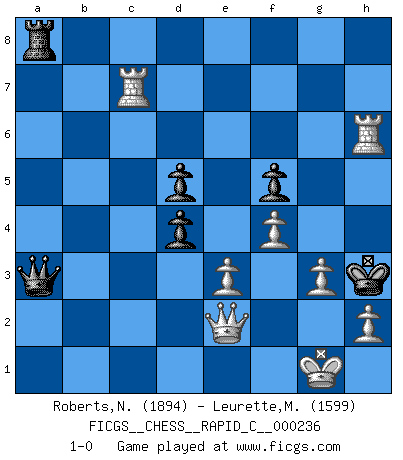 Last move : 1-0 2020 August 21 16:19:8 [Event "FICGS__CHESS__RAPID_C__000236"] [Site "FICGS"] [Date "2020.05.12"] [Round "1"] [White "Roberts,Neil"] [Black "Leurette,Marc-Antoine"] [Result "1-0"] [WhiteElo "1894"] [BlackElo "1599"] 1.d4 d5 2.Bf4 Nf6 3.e3 Nc6 4.c4 e6 5.Nc3 Bd6 6.Bxd6 Qxd6 7.Nf3 Bd7 8.c5 Qe7 9.b4 O-O 10.b5 Na5 11.Qa4 b6 12.c6 Bc8 13.Qc2 a6 14.a4 Ne8 15.Bd3 Nd6 16.Bxh7+ Kh8 17.Bd3 Nac4 18.O-O g6 19.Ne5 Nxe5 20.dxe5 Nf5 21.a5 bxa5 22.Rxa5 f6 23.Bxf5 gxf5 24.exf6 Rxf6 25.Rfa1 Rh6 26.bxa6 Qd6 27.g3 Qxc6 28.a7 Bb7 29.Qb2 d4 30.Nd5 exd5 31.Rc1 Qb6 32.Rb5 Qxa7 33.Rxb7 Qa3 34.Rb8+ Kg7 35.Rxc7+ Kg6 36.Rb6+ Kg5 37.f4+ Kg4 38.Qe2+ Kh3 39.Rxh6+ 1-0 Queen's pawn, Mason variation Kingside Castling by player Black (move 9) Kingside Castling by player White (move 18) Player White won this chess game. Follow this game move after move (download)The laws of Chess do not permit a free choice: you have to move whether you like it or not. (Emanuel Lasker) Nur ein wirklich starker Spieler weiß wie schwach er spielt. (Savielly Grigorievitsch Tartakower) El Ajedrez es parte de la cultura, y si una cultura esta en decadencia, entonces también el Ajedrez declinará. (Mikhail Botvinnik) Je ne suis pas le dernier à jouer lâchement des coups douteux pendant le zeïtnot de l'adversaire pour l'achever: en effet les coups qui font le plus peur sont ceux que l'on ne comprend pas. Je me fais souvent peur quand je joue. (Un professeur anonyme) As the days dwindle down... to a precious few. (Maxwell Anderson)