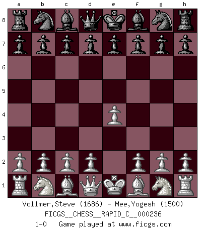 Last move : 1-0 2020 June 12 1:48:11 [Event "FICGS__CHESS__RAPID_C__000236"] [Site "FICGS"] [Date "2020.05.12"] [Round "1"] [White "Vollmer,Steve"] [Black "Mee,Yogesh"] [Result "1-0"] [WhiteElo "1686"] [BlackElo "1500"] 1.e4 1-0 This chess game has been lost on time (started : 2020.05.12 18:25:40) King's pawn Opening Player White won this chess game. Follow this game move after move (download)Adequate compensation for a sacrifice is having a sound combination leading to a winning position; adequate compensation for a blunder is having your opponent snatch defeat from the jaws of victory. (Bruce A. Moon) Irgendwie scheint mir sonntags früh um 9 Uhr der Killerinstinkt verloren gegangen zu sein. (Alexej Shirov) El Ajedrez es un invernadero donde los frutos del carácter pueden madurar mas completamente que en la vida. (Edward Morgan Foster) Tout change constamment, y compris dans le monde des Echecs. (Botvinnik) Over-the-board chess is the favorite of mortals, correspondence chess is the favorite of the gods. (Eduard Dyckhoff)