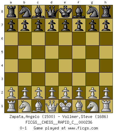 Last move : 0-1 2020 June 12 1:48:11 [Event "FICGS__CHESS__RAPID_C__000236"] [Site "FICGS"] [Date "2020.05.12"] [Round "1"] [White "Zapata,Angelo"] [Black "Vollmer,Steve"] [Result "0-1"] [WhiteElo "1500"] [BlackElo "1686"] 0-1 This chess game has been lost on time (started : 2020.05.12 18:25:40) Player Black won this chess game. Follow this game move after move (download)A thorough understanding of the typical mating continuations makes the most complicated sacrificial combinations leading up to them not only not difficult, but almost a matter of course. (Siegbert Tarrasch) Jeder weiß, dass Gasprom Putins persönliches Machtinstrument ist. Die Firma wird vom Kreml aus geleitet und wird schon deshalb nie transparent sein. (Garry Kasparov) En partidas rápidas, el Caballo es mas poderoso que el Alfil. (Vlastimil Hort) Votre seul travail dans les ouvertures est d'obtenir un milieu de partie jouable. (Lajos Portish) When you stop learning you start dying. (M. Scott Adams)