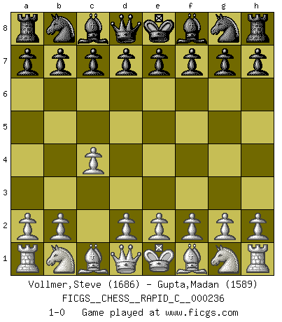 Last move : 1-0 2020 June 12 1:48:11 [Event "FICGS__CHESS__RAPID_C__000236"] [Site "FICGS"] [Date "2020.05.12"] [Round "1"] [White "Vollmer,Steve"] [Black "Gupta,Madan"] [Result "1-0"] [WhiteElo "1686"] [BlackElo "1589"] 1.c4 1-0 This chess game has been lost on time (started : 2020.05.12 18:25:40) English Opening Player White won this chess game. Follow this game move after move (download)It began to feel as though you were playing against Chess itself. - On playing against Robert Fischer. (Walter Shipman) Wie, soll nun auch die Opposition abgeschafft werden? Ja, es tut mir leid, Ihnen diesen Schmerz nicht ersparen zu können. (Aaron Nimzowitsch) Cuando tu casa esta en llamas, no puedes ser molestado por tus vecinos. O, como decinos en Ajedrez, si tu Rey esta bajo ataque, no te preocupa perder un Peón del lado de la Reina. (Gary Kasparov) La solitude du joueur d'Echecs à l'approche du mat est semblable à celle du condamné. (Francis Szpiner) Whatever you do, don't be bored. This is absolutely the most exciting time we could have possibly hoped to be alive. And things are just starting. (From movie Waking life)