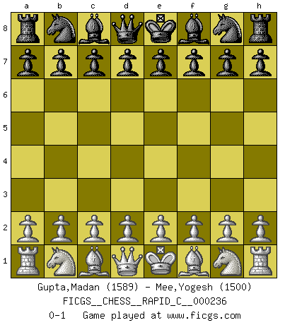 Last move : 0-1 2020 June 12 1:48:11 [Event "FICGS__CHESS__RAPID_C__000236"] [Site "FICGS"] [Date "2020.05.12"] [Round "1"] [White "Gupta,Madan"] [Black "Mee,Yogesh"] [Result "0-1"] [WhiteElo "1589"] [BlackElo "1500"] 0-1 This chess game has been lost on time (started : 2020.05.12 18:25:40) Player Black won this chess game. Follow this game move after move (download)The hallmark of the artist is simplicity. (Larry Evans) Bis zum Jahr 1971 verlief in meiner Schachkariere alles glatt. Dieses dramatische Match [Fischer-Taimanov 6:0] machte mein Leben zur Hölle. (Mark Taimanov) No hay otro maestro que tenga una voluntad terrífica de ganar. Al tablero, el irradía peligro y aún los oponentes mas fuertes tienden a congelarse como liebres cuando olfatean a una pantera. Aún sus debilidades son peligrosas. Con las blancas, su juego de apertura es predecible - te es posible hacer planes en su contra - pero es tan fuerte que tus planes casi nunca funcionan. En el juego medio, su precisión e invención son fabulosas y en finales, tú simplemente no le puedes vencer. (Experto Alemán anónimo) Je menace de comprendre la position. (Anonyme) The weakness of an artist is dogma. (Josh Waitzkin)