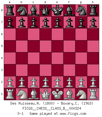 Last move : 0-1 2020 June 22 7:19:31 [Event "FICGS__CHESS__CLASS_B__000324"] [Site "FICGS"] [Date "2020.05.12"] [Round "1"] [White "Des Ruisseau,Nathaniel"] [Black "Bovary,Charles"] [Result "0-1"] [WhiteElo "1800"] [BlackElo "1963"] 0-1 This chess game has been lost on time (started : 2020.05.12 19:13:27) Player Black won this chess game. Follow this game move after move (download)Even the laziest King flees wildly in the face of a double check ! (Aaron Nimzowitsch) Dein Körper muss in Topform sein. Dein Schach verfällt, wenn dein Körper verfällt. Der Körper kann nicht vom Geist getrennt werden. (Robert James Fischer) Botvinnik trató de alejar el misterio referente al Ajedrez, siempre relacionandolo a situaciones de la vida diaria. Solía llamar al Ajedrez un problema inexacto típico, similar a aquellos en que la gente tiene siempre que resolver a cada día. (Garry Kasparov) Les Echecs mettent en conflit, non pas deux intelligences, mais deux volontés. (Lasker) All politicians must be presumed guilty until they are proven innocent. (Dinesh De Silva)