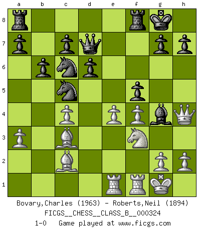 Last move : 1-0 2020 October 14 10:19:53 [Event "FICGS__CHESS__CLASS_B__000324"] [Site "FICGS"] [Date "2020.05.12"] [Round "1"] [White "Bovary,Charles"] [Black "Roberts,Neil"] [Result "1-0"] [WhiteElo "1963"] [BlackElo "1894"] 1.d4 Nf6 2.c4 e6 3.Nc3 Bb4 4.f3 O-O 5.a3 Bxc3+ 6.bxc3 d6 7.e4 Nc6 8.Bd3 b6 9.f4 e5 10.Nf3 Bg4 11.O-O exd4 12.Bb2 dxc3 13.Bxc3 Nd7 14.Bc2 Nc5 15.Qe1 Qd7 16.Qh4 f5 17.Rae1 1-0 This chess game has been lost on time (started : 2020.05.12 19:13:27) Nimzo-Indian : Kmoch variation Kingside Castling by player Black (move 4) Kingside Castling by player White (move 11) Player White won this chess game. Follow this game move after move (download)Though most people love to look at the games of the great attacking masters, some of the most successful players in history have been the quiet positional players. They slowly grind you down by taking away your space, tying up your pieces, and leaving you with virtually nothing to do ! (Yasser Seirawan) Es genügt nicht ein guter Spieler zu sein, man muß auch gut spielen. (Siegbert Tarrasch) En la vida, como en el Ajedrez, los Peones propios obstruyen nuestro camino. La gran fortuna de un hombre, su comodidad, placer, hijos, libros, que deberían ayudarle a ganar, con mucha frecuencia lo ponen en Jaque Mate. (Charles Buxton) Les échecs sont un jeu terrible. Si vous n'avez pas le centre, votre adversaire a une position plus libre. Par contre, si vous avez le centre, alors vous avez vraiment quelque chose pour laquelle vous inquiéter ! (Siegbert Tarrasch) Drag your thoughts away from your troubles... by the ears, by the heels, or any other way you can manage it. (Mark Twain)