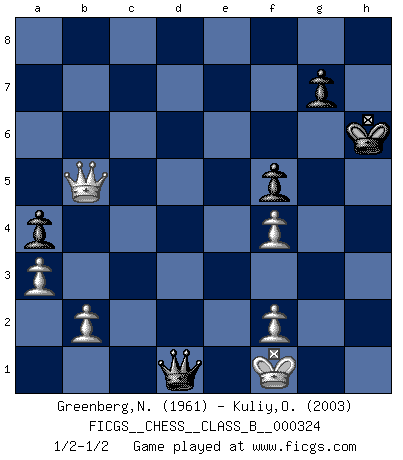 Last move : 1/2-1/2 2020 August 26 16:19:34 [Event "FICGS__CHESS__CLASS_B__000324"] [Site "FICGS"] [Date "2020.05.12"] [Round "1"] [White "Greenberg,Normund"] [Black "Kuliy,Oleksandr"] [Result "1/2-1/2"] [WhiteElo "1961"] [BlackElo "2003"] 1.d4 d5 2.c4 e6 3.Nc3 Nf6 4.Nf3 Be7 5.Bf4 O-O 6.e3 b6 7.Bd3 dxc4 8.Bxc4 Ba6 9.Bxa6 Nxa6 10.O-O c5 11.Qe2 Qc8 12.Rad1 Qb7 13.Rfe1 cxd4 14.Nxd4 Nb4 15.a3 Nbd5 16.Nxd5 Nxd5 17.Qf3 Rad8 18.Bg3 Rd7 19.h3 Rc8 20.Be5 a6 21.Rc1 Bd6 22.Bxd6 Rxd6 23.Rxc8+ Qxc8 24.Re2 Rd7 25.Rc2 Rc7 26.Qe4 Rxc2 27.Nxc2 h6 28.Kf1 Qc5 29.Ne1 Qb5+ 30.Nd3 a5 31.Kg1 Qc6 32.Qd4 f6 33.Nf4 Nxf4 34.exf4 a4 35.Kh2 b5 36.h4 Qd5 37.Qc3 Qe4 38.Kg3 Qf5 39.Qc8+ Kh7 40.Qd7 Qg6+ 41.Kf3 Qh5+ 42.g4 Qxh4 43.Qxe6 h5 44.gxh5 Qxh5+ 45.Ke3 Qc5+ 46.Kf3 Qh5+ 47.Kg3 f5 48.Qe5 Qg4+ 49.Kh2 Qh4+ 50.Kg1 Qg4+ 51.Kf1 Kh6 52.Qxb5 Qd1+ 53.Kg2 Qg4+ 54.Kf1 Qd1+ 55.Kg2 Qg4+ 56.Kh1 Qh3+ 57.Kg1 Qg4+ 58.Kf1 Qd1+ 1/2-1/2 QGD : Classical variation (5.Bf4) Kingside Castling by player Black (move 5) Kingside Castling by player White (move 10) This chess game ended in a draw. Follow this game move after move (download)It was clear to me that the vulnerable point of the American Grandmaster (Bobby Fischer) was in double-edged, hanging, irrational positions, where he often failed to find a win even in a won position. (Efim Geller) Sehr viele beherrschen heutzutage das große Einmalseins des Schachspiels und kennen sogar dessen Logarithmentafeln auswendig - deshalb sollte man hin und wieder zu beweisen trachten, dass zwei mal zwei auch fünf sein kann. (Mikhail Nekhemyevich Tal) Coloca el contenido del tablero de Ajedrez en un sombrero, agita las piezas vigorosamente, derrámalas en el tablero desde una altura de medio metro y así obtienes el estilo de Wilhelm Steinitz. (H. E. Bird) Les échecs c'est le défi de l'alpiniste, toujours plus haut, prêt à tout pour monter à l'assaut du Roi ennemi. Les échecs, c'est de la musique en mouvement, un ballet majestueux pour les yeux. C'est de la poésie composée par les fantômes du passé qui au même titre que Rimbaud ou Verlaine méritent notre admiration. Les échecs, c'est de la peinture ou le moindre mouvement modifie le tableau pour en faire un Picasso ou un Van Gogh. Les échecs, c'est tout et rien, c'est la vie et la mort. Jjulie33 sur le forum de France-Echecs. Computers have lots of memory but no imagination. (Anonymous)