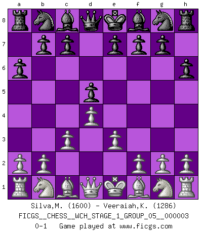 Last move : 0-1 2007 August 20 4:30:30 [Event "FICGS__CHESS__WCH_STAGE_1_GROUP_05__000003"] [Site "FICGS"] [Date "2007.07.11"] [Round "1"] [White "Silva,Miguela"] [Black "Veeraiah,Karuppaiah"] [Result "0-1"] [WhiteElo "1600"] [BlackElo "1286"] 1.d4 d5 2.c3 h6 3.e3 a6 0-1 This chess game has been lost on time (started : 2007.07.11 16:54:55) Queen's pawn game Player Black won this chess game. Follow this game move after move (download)Chess is above all, a fight ! (Emanuel Lasker) Ein bischen Romantik kann weder im Schach noch in der Liebe schaden. Also versuche ich mich ab und zu daran zu erinnern. (Nigel Short) El Ajedrez era la lengua materna de Capablanca. (Reti) Donnez-moi un Cavalier en 6e et je gagnerais toutes mes parties. (Steinitz) Big Chess is a place for big hallucinations. (Thibault de Vassal)