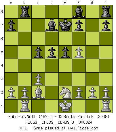 Last move : 0-1 2020 November 9 12:31:0 [Event "FICGS__CHESS__CLASS_B__000324"] [Site "FICGS"] [Date "2020.05.12"] [Round "1"] [White "Roberts,Neil"] [Black "DeBonis,Patrick"] [Result "0-1"] [WhiteElo "1894"] [BlackElo "2035"] 1.d4 Nf6 2.Bf4 c5 3.d5 d6 4.Nc3 e5 5.Bd2 b5 6.Nxb5 Nxd5 7.e4 Nf6 8.Bg5 Nc6 9.Bxf6 gxf6 10.Nc3 Nd4 11.Nd5 Rb8 12.Rb1 f5 13.c3 Nc6 14.Qa4 Bd7 15.Bb5 Qa5 16.exf5 Qxa4 17.Bxa4 Kd8 18.Bc2 Ne7 19.Nxe7 Kxe7 20.Ne2 d5 0-1 This chess game has been lost on time (started : 2020.05.12 19:13:27) Follow this game move after move (download)The way he plays Chess demonstrates a man's whole nature. (Stanley Ellin) Wenn du gegen Bobby spielst, ist es keine Frage von gewinnen oder verlieren. Es ist eine Frage des Überlebens. (Boris Vassilievich Spassky) En posiciones complicadas, Bobby Fischer pocas veces tuvo que temer de cualquiera. (Paul Keres) On n'a jamais que l'âge auquel on a commence à jouer aux échecs car après on cesse de vieillir. (Capablanca) Men should grow up. - Yeah. And dogs should stop licking themselves. It's not gonna happen. (Gregory House to Dr. Cameron, House M.D.)