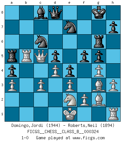Last move : 1-0 2020 December 11 12:33:38 [Event "FICGS__CHESS__CLASS_B__000324"] [Site "FICGS"] [Date "2020.05.12"] [Round "1"] [White "Domingo,Jordi"] [Black "Roberts,Neil"] [Result "1-0"] [WhiteElo "1944"] [BlackElo "1894"] 1.g4 d5 2.h3 e5 3.Bg2 c6 4.d4 e4 5.c4 Bb4+ 6.Nc3 Ne7 7.Qb3 a5 8.a3 Bxc3+ 9.bxc3 a4 10.Qb4 O-O 11.Bg5 f6 12.Bf4 Rf7 13.e3 b5 14.cxb5 cxb5 15.Ne2 Nbc6 16.Qc5 g5 17.Bd6 f5 18.Rb1 Rf6 19.Be5 Rg6 20.Bg3 Ra5 21.Rxb5 1-0 This chess game has been lost on time (started : 2020.05.12 19:13:27) Follow this game move after move (download)Winning isn't everything... but losing is nothing. (Mednis) Besser ein falscher Plan, logisch durchgeführt, als gar kein Plan. (Viktor Kortschnoi) Tu no necesitas jugar muy bien, únicamente ayudar a tu oponenet a que juegue muy mal. (Genrikh Chepukaitis) Je ne crois pas en la psychologie, je crois aux bons coups. (Robert Fischer) Before all elsed, be armed. (Niccolo Machiavelli)