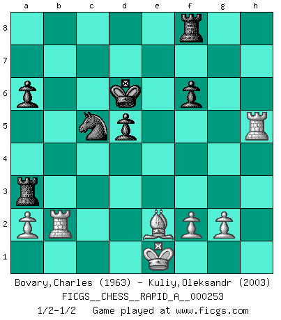 Last move : 1/2-1/2 2020 May 30 18:7:31 [Event "FICGS__CHESS__RAPID_A__000253"] [Site "FICGS"] [Date "2020.05.13"] [Round "1"] [White "Bovary,Charles"] [Black "Kuliy,Oleksandr"] [Result "1/2-1/2"] [WhiteElo "1963"] [BlackElo "2003"] 1.e4 e6 2.d4 d5 3.Nc3 Nf6 4.Bg5 Be7 5.e5 Nfd7 6.h4 c5 7.Bxe7 Kxe7 8.Qg4 Nc6 9.dxc5 Kf8 10.Nf3 Ndxe5 11.Nxe5 Nxe5 12.Qg3 Nd7 13.Nb5 a6 14.Qa3 Kg8 15.Nd6 Qc7 16.b4 b6 17.Qf3 Nf6 18.Qe3 bxc5 19.Qxc5 Qxc5 20.bxc5 Kf8 21.Rb1 Ke7 22.Rh3 Nd7 23.Rf3 f6 24.Nb7 Bxb7 25.Rxb7 Rhc8 26.Rc3 Rc6 27.h5 Kd8 28.Rg3 g5 29.hxg6 hxg6 30.Rxg6 Kc8 31.Rb1 Kc7 32.c4 Rxc5 33.cxd5 exd5 34.Kd2 Ra5 35.Rb2 Rf8 36.Be2 Ra3 37.Ke1 Nc5 38.Rh6 Kd6 39.Rh5 1/2-1/2 French : Albin-Alekhine-Chatard attack, Breyer variation This chess game ended in a draw. Follow this game move after move (download)Some sacrifices are sound; the rest are mine. (Mikhail Tal) Ein unbeabsichtigtes Patt ist der Gipfel der Dummheit. (Anonymous) Un buen jugador siempre tiene buena suerte. (José Raúl Capablanca) Les ravages du H expliquent la différence de niveau entre Tal et Thal [Abergel]. We're missing something. (Gregory House, House M.D.)