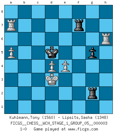 Last move : 1-0 2007 September 24 15:43:32 [Event "FICGS__CHESS__WCH_STAGE_1_GROUP_05__000003"] [Site "FICGS"] [Date "2007.07.11"] [Round "1"] [White "Kuhlmann,Tony"] [Black "Lipsits,Sasha"] [Result "1-0"] [WhiteElo "1560"] [BlackElo "1348"] 1.d4 d5 2.c4 e6 3.Nc3 Nf6 4.cxd5 exd5 5.Bg5 Be7 6.e3 h6 7.Bh4 O-O 8.Bd3 b6 9.Nge2 Be6 10.O-O c6 11.a3 c5 12.Rc1 c4 13.Bc2 g5 14.Bg3 Nc6 15.Nb1 Nh5 16.b3 Nxg3 17.Nxg3 Qd7 18.bxc4 dxc4 19.Ba4 a6 20.Bxc6 Qxc6 21.Nc3 Qc7 22.a4 Rad8 23.Rb1 f5 24.Qc2 Bf6 25.Nxf5 Bxf5 26.Qxf5 Kg7 27.Qg4 Rfe8 28.h4 Qd6 29.Ne4 Qe6 30.Nxf6 Qxf6 31.hxg5 hxg5 32.Rfc1 Rc8 33.Qd7+ Qf7 34.Qxf7 Kxf7 35.Rxb6 Re6 36.Rb7+ Re7 37.Rb4 c3 38.Kf1 Rec7 39.a5 Rh8 40.Ke2 Rh2 41.Rb6 Kg7 42.g4 Rf7 43.Kd3 Rhxf2 44.Rxc3 Rg2 45.R3c6 Rxg4 46.Rg6+ Kh7 47.Rh6+ Kg7 48.Rbg6+ Kf8 49.Rh8+ Ke7 50.Rxa6 Rg2 51.Ra7+ Kd6 52.Rh6+ Kd5 53.e4+ 1-0 QGD : Exchange, positional line Kingside Castling by player Black (move 7) Kingside Castling by player White (move 10) 10 pieces endgame at move 50 : White KRRPPP , Black KRRP WHITE : King + 2 Rooks 3 Pawns BLACK : King + 2 Rooks 1 Pawn Player White won this chess game. Follow this game move after move (download)Personally, I rather look forward to a computer program winning the world Chess Championship. Humanity needs a lesson in humility. (Richard Dawkings) Ich würde mich als ganz normalen Jungen bezeichnen [Im Alter von 12]. (Sergej Karjakin) El Ajedrez es una manera fabulosa para que los niños aprendan a autovalorarse y a autoestimarse. (Saudin Robovic) Même un GMI sait rarement calculer sur plus de cinq coups une attaque à sacrifices. (Rudolf Spielmann) The only thing that overcomes hard luck is hard work. (Harry Golden)