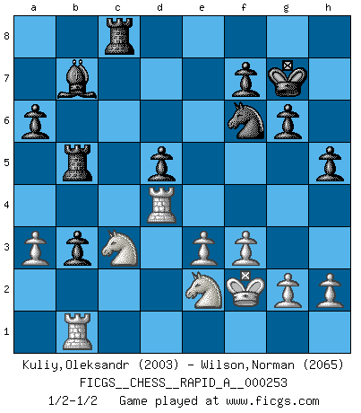 Last move : 1/2-1/2 2020 June 5 14:5:25 [Event "FICGS__CHESS__RAPID_A__000253"] [Site "FICGS"] [Date "2020.05.13"] [Round "1"] [White "Kuliy,Oleksandr"] [Black "Wilson,Norman"] [Result "1/2-1/2"] [WhiteElo "2003"] [BlackElo "2065"] 1.d4 d5 2.c4 e6 3.Nc3 a6 4.cxd5 exd5 5.Bf4 Nf6 6.e3 Bd6 7.Bxd6 Qxd6 8.Bd3 O-O 9.Nge2 b6 10.O-O c5 11.f3 Bb7 12.Qd2 Re8 13.Rad1 Nbd7 14.Bc2 Rac8 15.Rfe1 b5 16.a3 Nb6 17.Bb3 Nc4 18.Bxc4 bxc4 19.Ng3 g6 20.dxc5 Qxc5 21.Qd4 Kg7 22.Kf2 Qxd4 23.Rxd4 Re6 24.Rb1 Rb6 25.Nge2 h5 26.b4 cxb3 27.Na4 Rb5 28.Nac3 1/2-1/2 QGD : Janowski variation Kingside Castling by player Black (move 8) Kingside Castling by player White (move 10) This chess game ended in a draw. Follow this game move after move (download)In life, as in Chess, one's own Pawns block one's way. A man's very wealth, ease, leisure, children, books, which should help him to win, more often checkmate him. (Charles Buxton) Ich würde mich als ganz normalen Jungen bezeichnen [Im Alter von 12]. (Sergej Karjakin) Un mal día en el Ajedrez, es mejor que cualquier buen día en el trabajo. (Anonymous) Les échecs sont utiles à l'exercice de la faculté de penser et à celle de l'imagination. Car nous devons posséder une méthode élaborée pour atteindre des buts partout où nous devons conduire notre raison. (Leibnitz) The various flowers seem good to different people. (Chinese proverb)