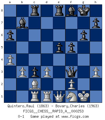 Last move : 0-1 2020 June 22 8:16:57 [Event "FICGS__CHESS__RAPID_A__000253"] [Site "FICGS"] [Date "2020.05.13"] [Round "1"] [White "Quintero,Raul"] [Black "Bovary,Charles"] [Result "0-1"] [WhiteElo "1863"] [BlackElo "1963"] 1.e4 e5 2.Nf3 Nc6 3.Bb5 a6 4.Ba4 Nf6 5.d3 b5 6.Bb3 Be7 7.c3 d5 8.Nbd2 O-O 9.Qe2 Bb7 10.O-O Re8 11.Re1 Bf8 12.a4 Na5 13.Bc2 b4 14.h3 c5 15.cxb4 cxb4 16.b3 Rc8 17.Bd1 dxe4 18.Nxe4 Nd5 19.Bd2 Nc3 20.Bxc3 bxc3 21.Bc2 Nc6 22.Red1 f5 23.Ng3 g6 24.Rac1 Qd5 25.Nf1 Nd4 26.Qe1 Nxf3+ 27.gxf3 Qxf3 0-1 Ruy Lopez : Anderssen variation Kingside Castling by player Black (move 8) Kingside Castling by player White (move 10) Player Black won this chess game. Follow this game move after move (download)Chess is a sea in which a gnat may drink and an elephant may bathe. (Hindu proverb) Alles was ich jemals tun will ist Schach spielen. (Robert James Fischer) No existe un remordimiento como el remordimiento del Ajedrez. (H. G. Wells) Des idées, des idées, j'en ai cent, j'en ai mille. Des bonnes, des mauvaises, applicables, irréalisables... Il suffit de faire le tri ! (Roos) Either move or be moved. (Ezra Pound)