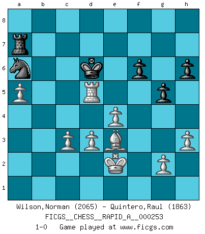 Last move : 1-0 2020 July 5 5:40:2 [Event "FICGS__CHESS__RAPID_A__000253"] [Site "FICGS"] [Date "2020.05.13"] [Round "1"] [White "Wilson,Norman"] [Black "Quintero,Raul"] [Result "1-0"] [WhiteElo "2065"] [BlackElo "1863"] 1.e4 e5 2.Nf3 Nc6 3.Bc4 Be7 4.d3 Nf6 5.O-O O-O 6.a4 d6 7.Re1 Be6 8.Nbd2 Qd7 9.h3 Rad8 10.c3 h6 11.b4 Bxc4 12.Nxc4 a6 13.b5 Nb8 14.Qb3 c6 15.bxa6 Nxa6 16.Be3 c5 17.Reb1 Rb8 18.Nb6 Qc6 19.Nh4 Kh8 20.Nf5 Bd8 21.a5 Bxb6 22.Qxb6 Rfd8 23.Qxc6 bxc6 24.Rxb8 Rxb8 25.Nxd6 Kg8 26.Nc4 Nd7 27.Kf1 f6 28.Ke2 Kf7 29.f4 exf4 30.Bxf4 Ra8 31.Nb6 Ra7 32.Nxd7 Rxd7 33.Rb1 g5 34.Be3 Ke6 35.Rb6 Ra7 36.Rxc6+ Ke7 37.Rxc5 Kd6 38.Rd5+ 1-0 Hungarian defense Kingside Castling by player White (move 5) Kingside Castling by player Black (move 5) Player White won this chess game. Follow this game move after move (download)We don't really know how the game was invented, though there are suspicions. As soon as we discover the culprits, we'll let you know. (Bruce Pandolfini) Die jungen Leute sollen verstehen, dass sie noch etwas von mir lernen können und müssen. (Viktor Kortschnoi) Existen dos clases de sacrificios: los correctos y los míos. (Mikhail Tal) Le temps de noter son nom sur la feuille de partie, j'étais déjà en zeitnot ! D'un modeste amateur apparié lors de la première ronde d'un open contre le grand-maître Azmaïparashvili. If only faces could talk... (Pat Summerall, Sportscaster during the Super Bowl)