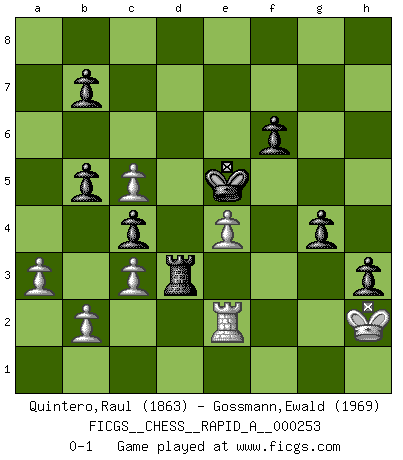 Last move : 0-1 2020 July 7 23:57:26 [Event "FICGS__CHESS__RAPID_A__000253"] [Site "FICGS"] [Date "2020.05.13"] [Round "1"] [White "Quintero,Raul"] [Black "Gossmann,Ewald"] [Result "0-1"] [WhiteElo "1863"] [BlackElo "1969"] 1.d4 Nf6 2.Bf4 d5 3.Nf3 c5 4.e3 Nc6 5.c3 Qb6 6.Qb3 c4 7.Qxb6 axb6 8.Nbd2 b5 9.Be2 h6 10.h3 Bf5 11.O-O e6 12.a3 Be7 13.Rfe1 O-O 14.Ne5 Bh7 15.Rac1 Rfd8 16.Bd1 Na5 17.Bc2 Bxc2 18.Rxc2 Nc6 19.e4 dxe4 20.Nxe4 Nxe5 21.Bxe5 Nd5 22.Rce2 f6 23.Bg3 Kf7 24.Nc5 Bxc5 25.dxc5 e5 26.f3 Rac8 27.Bf2 Nf4 28.Rc2 Ke6 29.Rb1 Rd3 30.Kh2 Rcd8 31.g3 Nd5 32.Kg2 Ne3+ 33.Bxe3 Rxe3 34.Rf1 h5 35.R1f2 e4 36.fxe4 R8d3 37.h4 Rxg3+ 38.Kh1 Rg4 39.Rce2 Rh3+ 40.Rh2 Rgxh4 41.Rxh3 Rxh3+ 42.Kg2 Rd3 43.Kh2 g5 44.Rf2 h4 45.Kg2 g4 46.Re2 h3+ 47.Kh2 Ke5 0-1 Queen's pawn game Kingside Castling by player White (move 11) Kingside Castling by player Black (move 13) Player Black won this chess game. Follow this game move after move (download)A bad plan is better than none at all. (Frank Marshall) Schach ist wie eine schöne Frau, zu der wir ständig zurückkehren, gleichviel, wie oft sie uns zurückweist. (Anonymous) La partida mas dura de ganar es una partida ganada. (Emanuel Lasker) C'est la seule position que je connaisse où les deux camps sont mals. Propos prêtés à V. Anand. Think like a man of action, act like a man of thought. (Henri Louis Bergson)