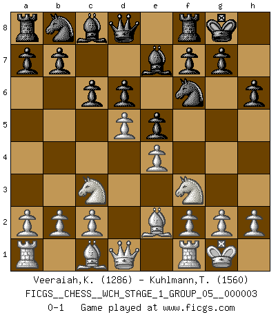 Last move : 0-1 2007 August 20 10:31:22 [Event "FICGS__CHESS__WCH_STAGE_1_GROUP_05__000003"] [Site "FICGS"] [Date "2007.07.11"] [Round "1"] [White "Veeraiah,Karuppaiah"] [Black "Kuhlmann,Tony"] [Result "0-1"] [WhiteElo "1286"] [BlackElo "1560"] 1.e4 d6 2.d4 Nf6 3.Nc3 e5 4.d5 h6 5.Nf3 c6 6.Be2 Be7 7.O-O O-O 0-1 This chess game has been lost on time (started : 2007.07.11 16:54:55) Pirc defense Kingside Castling by player White (move 7) Kingside Castling by player Black (move 7) Player Black won this chess game. Follow this game move after move (download)Checkers is for tramps. (Paul Morphy) Mutter, ich bin eben Ex-Weltmeister geworden. --beim nach Hause Kommen nach dem Verlust des WM-Titels an Mihail Botvinnik -- (Mikhail Nekhemyevich Tal) En el Ajedrez, cuando menos, el valiente hereda la tierra. (Edmar Mednis) Je ne crois pas en la psychologie, je crois aux bons coups. (Robert Fischer) A person who never made a mistake never tried anything new. (Albert Einstein)