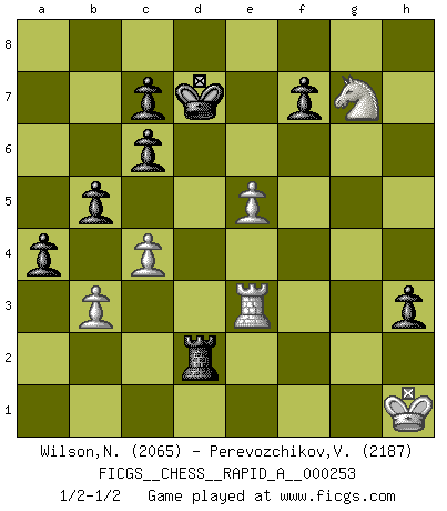 Last move : 1/2-1/2 2020 June 4 10:8:46 [Event "FICGS__CHESS__RAPID_A__000253"] [Site "FICGS"] [Date "2020.05.13"] [Round "1"] [White "Wilson,Norman"] [Black "Perevozchikov,Vjacheslav"] [Result "1/2-1/2"] [WhiteElo "2065"] [BlackElo "2187"] 1.e4 e5 2.Nf3 Nc6 3.Bb5 Nf6 4.O-O Nxe4 5.d4 Nd6 6.Bxc6 dxc6 7.dxe5 Nf5 8.Qxd8+ Kxd8 9.Rd1+ Ke8 10.Nc3 Be7 11.h3 h5 12.b3 Nh4 13.Nxh4 Bxh4 14.Ne2 Be7 15.Be3 a5 16.c3 g5 17.Rd2 h4 18.Nd4 Rg8 19.Kh2 Bd7 20.Rad1 Rd8 21.c4 Bc8 22.Kh1 g4 23.hxg4 Bxg4 24.f3 Bc8 25.Kh2 Bg5 26.Nc2 Rxd2 27.Rxd2 Bd7 28.Rd1 Rg6 29.Bxg5 Rxg5 30.Re1 Ke7 31.Kg1 h3 32.g4 Bxg4 33.fxg4 Rxg4+ 34.Kh1 Rg2 35.Nd4 Rxa2 36.Re4 Rd2 37.Nf5+ Kd7 38.Re3 b5 39.Ng7 a4 1/2-1/2 Ruy Lopez : Berlin defense, Open variation Kingside Castling by player White (move 4) This chess game ended in a draw. Follow this game move after move (download)The battle for the ultimate truth will never be won. And that's why Chess is so fascinating. (Hans Kmoch) Rauchen ist dem Schachspieler bei seiner Arbeit, also im Wettkampf, untersagt. (Viktor Kortschnoi) El Ajedrez es imaginación. (David Bronstein) Si rien de grave n'est détecté lors de l'analyse d'une position, on joue alors le coup. Seconde règle de Blumenfeld. Always two there are. No more no less. A master, and an apprentice. (Master Yoda in Star Wars ep.1)