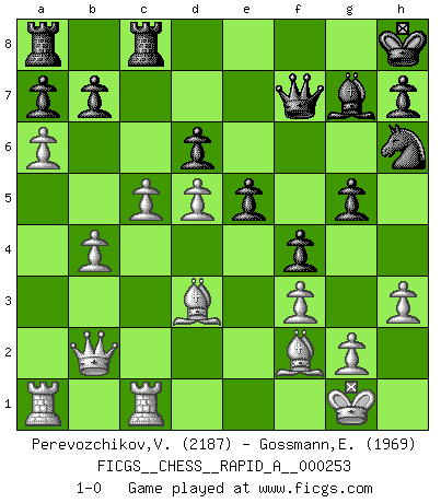 Last move : 1-0 2020 June 10 8:26:29 [Event "FICGS__CHESS__RAPID_A__000253"] [Site "FICGS"] [Date "2020.05.13"] [Round "1"] [White "Perevozchikov,Vjacheslav"] [Black "Gossmann,Ewald"] [Result "1-0"] [WhiteElo "2187"] [BlackElo "1969"] 1.Nf3 Nf6 2.d4 g6 3.c4 d6 4.Nc3 Bg7 5.e4 O-O 6.Be2 e5 7.O-O Na6 8.Be3 Ng4 9.Bg5 Qe8 10.Nd5 f6 11.Bh4 c6 12.Nc3 Nh6 13.d5 Nf7 14.Ne1 f5 15.f3 Nc7 16.Qb3 Rb8 17.dxc6 Qxc6 18.Nc2 f4 19.Nb4 Qe8 20.Nbd5 Nxd5 21.Nxd5 Kh8 22.Rfd1 Qc6 23.a4 Be6 24.a5 Ra8 25.Bf2 g5 26.h3 Rfd8 27.Qc2 Bf8 28.b4 Rdc8 29.Qb2 Bxd5 30.exd5 Qc7 31.Bd3 Nh6 32.Rdc1 Qf7 33.c5 Bg7 34.a6 1-0 Reti Opening Kingside Castling by player Black (move 5) Kingside Castling by player White (move 7) Player White won this chess game. Follow this game move after move (download)If you aren't afraid of Spassky, then I have removed the element of money. (Jim Slater) Gewöhnliche Menschen denken nur daran, wie sie ihre Zeit verbringen. Ein intelligenter Mensch versucht, sie auszunutzen. (Arthur Schopenhauer) En el Ajedrez, tal como es jugado por los Maestros, practicamente la suerte es eliminada. (Emanuel Lasker) Avec des compensations pour le matériel en plus... (Anonyme) Do you know these so called Volunteers don't even get paid! (Simpsons)