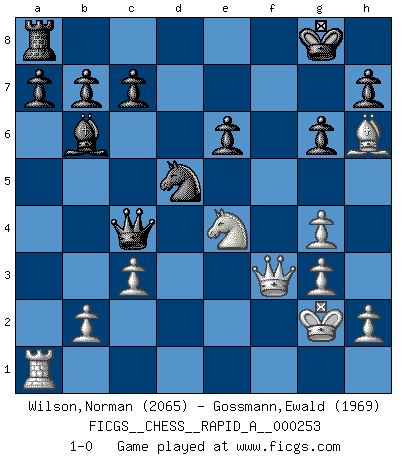 Last move : 1-0 2020 May 21 15:9:23 [Event "FICGS__CHESS__RAPID_A__000253"] [Site "FICGS"] [Date "2020.05.13"] [Round "1"] [White "Wilson,Norman"] [Black "Gossmann,Ewald"] [Result "1-0"] [WhiteElo "2065"] [BlackElo "1969"] 1.e4 Nf6 2.e5 Nd5 3.d4 d6 4.Nf3 g6 5.Bc4 Nb6 6.Bb3 Bg7 7.Qe2 O-O 8.a4 dxe5 9.dxe5 Bg4 10.e6 Nd5 11.exf7+ Rxf7 12.Nbd2 Qd6 13.Ne4 Qc6 14.Nd4 Qd7 15.f3 Bxd4 16.fxg4 Nc6 17.c3 Bb6 18.Bh6 e6 19.g3 Na5 20.Ba2 Qxa4 21.Rf1 Rxf1+ 22.Kxf1 Qc6 23.Qf3 Nc4 24.Bxc4 Qxc4+ 25.Kg2 1-0 Alekhine's defense : Modern, Fianchetto variation Kingside Castling by player Black (move 7) Player White won this chess game. Follow this game move after move (download)Bobby is the finest Chess player this country ever produced. His memory for the moves, his brilliance in dreaming up combinations, and his fierce determination to win are uncanny. (John Collins) Der Traum, für den ich lebe, ist der von einem freien Russland. Viele mögen sagen: Russland hat doch ein Parlament, einen gewählten Präsidenten. Aber ich spüre, dass in meiner Heimat die Angst wiederkehrt. Eine Angst, sich frei zu äußern, bestimmte Dinge zu tun (Garry Kasparov) El jugador táctico sabe que hacer cuando hay algo que hacer; mientras que el estratega sabe que hacer cuando no hay nada que hacer. (Gerald Abrahams) Plusieurs personnes se sont demandées comment Tal faisait pour gagner... En fait, c'est très simple ! Il met ses pièces au centre de l'échiquier et les sacrifie quelque part ! (David Bronstein) To err is human, but to really foul things up requires a computer. (Farmer's Almanac, 1978)