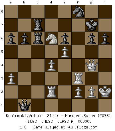 Last move : 1-0 2006 September 19 21:26:48 [Event "FICGS__CHESS__CLASS_A__000005"] [Site "FICGS"] [Date "2006.06.20"] [Round "1"] [White "Koslowski,Volker"] [Black "Marconi,Ralph"] [Result "1-0"] [WhiteElo "2141"] [BlackElo "2095"] 1.d4 e6 2.Nf3 Nf6 3.c4 b6 4.a3 Bb7 5.Nc3 d5 6.cxd5 Nxd5 7.Qc2 Nxc3 8.bxc3 Be7 9.e4 O-O 10.Bd3 c5 11.O-O Qc8 12.Qe2 Ba6 13.Rd1 Bxd3 14.Rxd3 Nd7 15.e5 Qc6 16.Bg5 Rfe8 17.Bxe7 Rxe7 18.Ng5 cxd4 19.cxd4 Rc8 20.Ne4 Qc2 21.Qe3 Nf8 22.h4 Rec7 23.Rad1 Rc6 24.h5 h6 25.Qf3 R8c7 26.Qg4 Kh8 27.Kh2 a6 28.Rg3 g5 29.hxg6 fxg6 30.Rd2 Qb1 31.Rf3 Kg7 32.Nd6 1-0 Queen's pawn Kingside Castling by player Black (move 9) Kingside Castling by player White (move 11) Player White won this chess game. Follow this game move after move (download)Do you realize Fischer almost never has any bad pieces? He exchanges them, and the bad pieces remain with his opponents. (Yuri Balashov) Man kann eine Schachpartie nur gewinnen, wenn das Gleichgewicht gestört ist. In einer Stellung mit ungestörtem Gleichgewicht ist auch das größte Genie hilflos - in der Stellung steckt dann eben kein genialer Einfall. (Wilhelm Steinitz) A la fecha, Fischer esta simplemente un nivel arriba de todos los mejores jugadores de Ajedrez del mundo. (John Jacobs) Les Cavaliers se révèlent fort utiles dans les positions fermées. D'habitude, les Fous sont un peu plus forts que les Cavaliers dans les positions ouvertes. Qu'on le veuille ou non, il restera toujours des exceptions ! Always two there are. No more no less. A master, and an apprentice. (Master Yoda in Star Wars ep.1)
