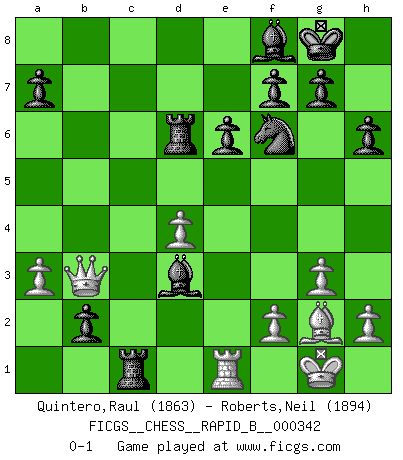 Last move : 0-1 2020 August 18 1:40:41 [Event "FICGS__CHESS__RAPID_B__000342"] [Site "FICGS"] [Date "2020.05.13"] [Round "1"] [White "Quintero,Raul"] [Black "Roberts,Neil"] [Result "0-1"] [WhiteElo "1863"] [BlackElo "1894"] 1.Nf3 Nf6 2.c4 e6 3.g3 d5 4.Bg2 Be7 5.b3 O-O 6.O-O c5 7.e3 Nc6 8.Bb2 b6 9.d3 Ba6 10.Nbd2 Qc7 11.a3 Rfd8 12.Qc2 Rac8 13.Rad1 Bf8 14.Rfe1 h6 15.d4 dxc4 16.bxc4 cxd4 17.exd4 Na5 18.Bf1 Nxc4 19.Nxc4 b5 20.Rc1 bxc4 21.Qa4 Rd6 22.Ne5 Qb7 23.Rc2 c3 24.Bg2 Qxb2 25.Rxb2 cxb2 26.Nd3 Bxd3 27.Qb3 Rc1 0-1 Reti Opening Kingside Castling by player Black (move 5) Kingside Castling by player White (move 6) Player Black won this chess game. Follow this game move after move (download)Dazzling combinations are for the many, shifting wood is for the few. (Georg Kieninger) Fischer ist das größte Genie, das je vom Schachhimmel heruntergestiegen ist. (Mikhail Nekhemyevich Tal) Los finales de Peón son del Ajedrez lo que el cesped es del Golf. (Cecil Purdy) Les écrivains ont utilisé les échecs pour analyser les côtés extrêmes de la nature humaine. Dans ce cadre, les échecs offrent un champ d'expérimentation idéal. Mais on pourrait faire la même chose avec la peinture. Et là, en vous référant à Van Gogh, vous ne tirerez pas de conclusion définitive sur les peintres. (Gary Kasparov) Life is like a game of cards: the hand you are dealt represents determinism; the way you play it is free will. (Jawaharlal Nehru)