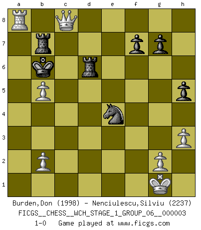 Last move : 1-0 2007 November 14 9:4:32 [Event "FICGS__CHESS__WCH_STAGE_1_GROUP_06__000003"] [Site "FICGS"] [Date "2007.07.11"] [Round "1"] [White "Burden,Don"] [Black "Nenciulescu,Silviu"] [Result "1-0"] [WhiteElo "1998"] [BlackElo "2237"] 1.e4 c5 2.Nf3 d6 3.d4 cxd4 4.Nxd4 Nf6 5.Nc3 a6 6.Bc4 e6 7.Bb3 Nc6 8.Be3 Qc7 9.f4 b5 10.Nxc6 Qxc6 11.f5 Be7 12.fxe6 Bxe6 13.Nd5 Nxe4 14.O-O Bd8 15.Nb4 Qc8 16.Qd4 Nf6 17.Qxd6 Be7 18.Qc6+ Qxc6 19.Nxc6 Bd6 20.h3 Bxb3 21.axb3 Kd7 22.Na7 Rhe8 23.Bd4 Be5 24.Bxe5 Rxe5 25.Rxa6 Rd5 26.c4 Rd2 27.c5 b4 28.c6+ Kd8 29.Rf4 Rb8 30.Rc4 Kc7 31.Nb5+ Rxb5 32.Ra7+ Kb8 33.c7+ Kxa7 34.c8Q Rd7 35.Rc1 Ra5 36.Qf8 h5 37.Qxb4 Ra6 38.Qc5+ Rb6 39.b4 Ne4 40.Qc8 Rbd6 41.Ra1+ Kb6 42.Ra8 Rb7 43.b5 1-0 Sicilian : Najdorf, Lipnitzky attack Kingside Castling by player White (move 14) Promotion Queen by player White (move 34) Player White won this chess game. Follow this game move after move (download)Chess is everything: art, science and sport. (Anatoly Karpov) Korrekt heißt in Deutschland die Haltung eines Mannes, dessen Benehmen nach dem Urteile seiner Nachbarn seiner Stellung angemessen ist. Um korrekt zu sein, muß man sich der Meinung der anderen anpassen... (Emanuel Lasker) Un Peón pasado es un criminal, quién debe ser mantenido bajo candado y llave. Leves medidas, tales como vigilancia policiaca, no son suficientes. (Aaron Nimzovich) A chaque perte on perd un peu de soi. (Joël Lautier) After growing wildly for years, the field of computing appears to be reaching its infancy. (John Pierce)