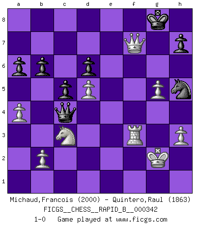 Last move : 1-0 2020 June 22 18:2:12 [Event "FICGS__CHESS__RAPID_B__000342"] [Site "FICGS"] [Date "2020.05.13"] [Round "1"] [White "Michaud,Francois"] [Black "Quintero,Raul"] [Result "1-0"] [WhiteElo "2000"] [BlackElo "1863"] 1.d4 Nf6 2.c4 c5 3.d5 d6 4.Nc3 g6 5.e4 Bg7 6.Bd3 O-O 7.h3 a6 8.a4 Nbd7 9.Nf3 Qc7 10.O-O e6 11.Be3 exd5 12.exd5 b6 13.Qd2 Bb7 14.g4 Rfe8 15.Rae1 Re7 16.Bh6 Rae8 17.Rxe7 Rxe7 18.Bxg7 Kxg7 19.Nh4 Ne5 20.g5 Ne8 21.f4 Nxd3 22.Qxd3 Bc8 23.f5 Bxf5 24.Nxf5+ gxf5 25.Rxf5 Re1+ 26.Kf2 Qe7 27.Ne2 Rh1 28.Kg2 Re1 29.Qc3+ Kg8 30.Qxe1 Qe4+ 31.Rf3 Qxc4 32.Nc3 Ng7 33.Qe7 Nh5 34.Qxf7+ 1-0 Benoni defense, Hromodka system Kingside Castling by player Black (move 6) Kingside Castling by player White (move 10) Player White won this chess game. Follow this game move after move (download)I'm not afraid of Spassky. The world knows I'm the best. You don't need a match to prove it. (Bobby Fischer) Ich weiss nicht was Gott gegen mich auf 1.e4 antworten würde. (Robert James Fischer) El Ajedrez es despiadado: debes de estar preparado para matar gente. (Nigel Short) Les réformistes prétendent que les progrès de la théorie conduiront à la disparition des échecs, et qu'il faut, pour leur rendre vie, en remanier les règles. En réalité, qu'exprime cette affirmation? Le mépris de l'intuition, de l'imagination et de tous les autres éléments qui font des échecs un art. (Alexander Alekhine) Nowadays, anyone who cannot speak English and is incapable of using the Internet is regarded as backward. (Al-Waleed bin Talal)