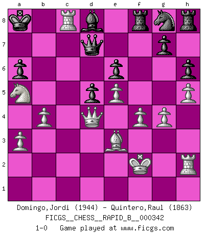 Last move : 1-0 2020 July 5 5:42:43 [Event "FICGS__CHESS__RAPID_B__000342"] [Site "FICGS"] [Date "2020.05.13"] [Round "1"] [White "Domingo,Jordi"] [Black "Quintero,Raul"] [Result "1-0"] [WhiteElo "1944"] [BlackElo "1863"] 1.e4 c6 2.d4 d5 3.e5 Bf5 4.h4 h6 5.g4 Bd7 6.h5 e6 7.f4 Qb6 8.Nf3 c5 9.c3 Nc6 10.Rh2 cxd4 11.cxd4 Bb4+ 12.Kf2 O-O-O 13.a3 Be7 14.b4 f6 15.Be3 fxe5 16.dxe5 Qc7 17.Nc3 Kb8 18.Nb5 Qc8 19.Rc1 a6 20.Nbd4 Rf8 21.Bxa6 bxa6 22.Nxc6+ Bxc6 23.Nd4 Qb7 24.Nxc6+ Ka8 25.Na5 Qb5 26.Qd4 Qd7 27.Rc6 Bd8 28.Rc8+ 1-0 Caro-Kann : Advance variation Queenside Castling by player Black (move 12) Player White won this chess game. Follow this game move after move (download)Chess is no whit inferior to the violin, and we have a large number of professional violinists. (Mikhail Botvinnik) Wie gewinnt Tal? Er entwickelt alle seine Figuren in die Brettmitte und opfert sie dann irgendwo. (Robert James Fischer) Un sacrificio se refuta mucho mejor al aceptarlo. (Wilhelm Steinitz) Lorsque vous vous retrouvez devant une position atroce, ne tendez pas un ultime piège dérisoire avec l'intention d'abandonner si l'adversaire le déjoue ! Faites-vous plutôt un devoir de résister comme si votre vie en dépendait. Jouez le coup qui vous déplairait au centuple si vous étiez dans la peau de votre tortionnaire ! Unless I accept my faults I will most certainly doubt my virtues. (Hugh Prather)