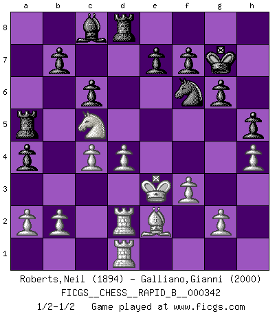 Last move : 1/2-1/2 2020 July 29 9:47:43 [Event "FICGS__CHESS__RAPID_B__000342"] [Site "FICGS"] [Date "2020.05.13"] [Round "1"] [White "Roberts,Neil"] [Black "Galliano,Gianni"] [Result "1/2-1/2"] [WhiteElo "1894"] [BlackElo "2000"] 1.d4 Nf6 2.Bf4 g6 3.Nc3 d5 4.e3 Bg7 5.h4 c6 6.Nf3 Qb6 7.Na4 Qd8 8.Ne5 Nbd7 9.Be2 h5 10.f3 Nxe5 11.Bxe5 Qa5+ 12.Nc3 Kf8 13.Qd2 Nd7 14.Bxg7+ Kxg7 15.e4 dxe4 16.Nxe4 Qxd2+ 17.Kxd2 Nf6 18.Rhd1 a5 19.Ke3 Rd8 20.Rd2 a4 21.c4 Ra5 22.Rad1 Be6 23.Nc5 Bc8 24.Ne4 Be6 25.Nc5 Bc8 1/2-1/2 Queen's pawn game This chess game ended in a draw. Follow this game move after move (download)Chess is the gymnasium of the mind. (Blaise Pascal) Obwohl ich vom Stil her kaum zu den Priestern der Schachkunst gezählt werde, halte ich Schach doch für eine Kunst. (Tigran Petrosjan) El poder defensivo de una pieza clavada, solamente es imaginario. (Aaron Nimzovich) L'ordinateur a tué l'originalité. Il n'y a plus guère d'aventures sur l'échiquier. (Jacob Murray) The quality of decision is like the well-timed swoop of a falcon which enables it to strike and destroy its victim. (Sun Tzu)