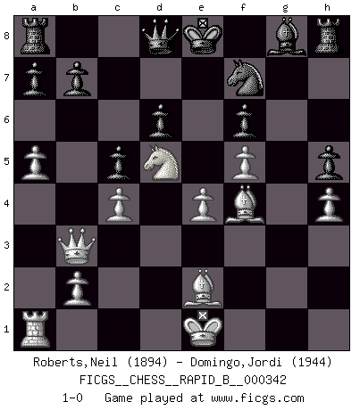 Last move : 1-0 2020 August 29 20:57:0 [Event "FICGS__CHESS__RAPID_B__000342"] [Site "FICGS"] [Date "2020.05.13"] [Round "1"] [White "Roberts,Neil"] [Black "Domingo,Jordi"] [Result "1-0"] [WhiteElo "1894"] [BlackElo "1944"] 1.d4 h6 2.e4 c5 3.d5 d6 4.c4 g5 5.h4 g4 6.Nc3 Bg7 7.Qc2 Nd7 8.f4 gxf3 9.gxf3 h5 10.Nh3 Ne5 11.Ng5 Nh6 12.Be2 Bd7 13.Rg1 Bf6 14.Bd2 Qb6 15.a4 Ng6 16.Ne6 fxe6 17.Rxg6 Nf7 18.dxe6 Bxe6 19.f4 Nd8 20.Rxf6 exf6 21.f5 Bg8 22.a5 Qc7 23.Bf4 Nf7 24.Nd5 Qd8 25.Qb3 1-0 Queen's pawn Player White won this chess game. Follow this game move after move (download)On the chessboard, lies and hypocrisy do not survive long. (Emanuel Lasker) Wir können eben der zündenden Macht des Opfers nicht wiederstehen, denn die Begeisterung für das Opfer liegt in der Natur des Menschen. (Rudolf Spielmann) Cualquier cambio de material en una posición debe venir por medio de un mate, una captura o promoción de Peón. (Purdy) À la honte des hommes, on sait que les lois du jeu sont les seules qui soient partout justes, claires, inviolables et exécutées. Pourquoi l'Indien qui a donné les règles du jeu d'échecs est-il obéi de bon gré dans toute la terre, et que les décrétales des papes, par exemple, sont aujourd'hui un objet d'horreur et de mépris ? C'est que l'inventeur des échecs combina tout avec justesse pour la satisfaction des joueurs, et que les papes, dans leurs décrétales, n'eurent en vue que leur seul avantage. L'Indien voulut exercer également l'esprit des hommes et leur donner du plaisir; les papes ont voulu abrutir l'esprit des hommes. Voltaire (Dictionnaire philosophique / Garnier 1967) Warrior pose battles inner weakness and wins focus. You see that there is no war within you. You're on your own side, and you are your own strength. (Terri Guillemets)
