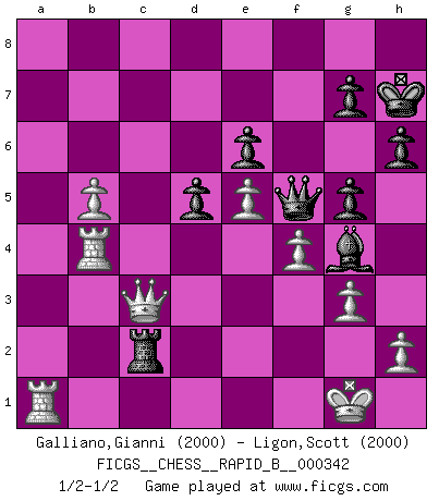 Last move : 1/2-1/2 2020 June 26 18:56:33 [Event "FICGS__CHESS__RAPID_B__000342"] [Site "FICGS"] [Date "2020.05.13"] [Round "1"] [White "Galliano,Gianni"] [Black "Ligon,Scott"] [Result "1/2-1/2"] [WhiteElo "2000"] [BlackElo "2000"] 1.e4 c6 2.d4 d5 3.e5 c5 4.dxc5 e6 5.a3 Bxc5 6.Nf3 a6 7.b4 Ba7 8.Bd3 Ne7 9.Bb2 Nbc6 10.Nbd2 Ng6 11.c4 Qc7 12.Bxg6 fxg6 13.O-O O-O 14.Rc1 Qe7 15.Bc3 Qd8 16.b5 axb5 17.cxb5 Ne7 18.Nb3 Bb6 19.Bb4 Bd7 20.Nfd4 Rf7 21.Nc5 Bxc5 22.Bxc5 Nf5 23.a4 h6 24.Nxf5 Rxf5 25.Qd4 Qg5 26.g3 Rf7 27.Ra1 Qf5 28.Rfb1 Be8 29.Rb4 Rc7 30.Bd6 Rc2 31.a5 g5 32.a6 Bh5 33.Rb3 b6 34.Qxb6 Rac8 35.Ba3 R8c4 36.a7 Ra4 37.Rb4 Rxa3 38.a8Q+ Rxa8 39.Rxa8+ Kh7 40.Ra1 Bf3 41.Qd4 Re2 42.Qc3 Bg4 43.f4 Rc2 1/2-1/2 Caro-Kann : Advance variation Kingside Castling by player White (move 13) Kingside Castling by player Black (move 13) Promotion Queen by player White (move 38) This chess game ended in a draw. Follow this game move after move (download)It is difficult to play against Einstein's theory --on his first loss to Fischer. (Mikhail Tal) Es ist nicht das erste mal, dass sich die FIDE dem Arabischen Geld gebeugt hat (über die FIDE WM 2004 in Lybien). (Larry Evans) Te sientas frente a un tablero y repentinamente tu corazón brinca. Tu mano tiembla al tomar una pieza y moverla. Pero lo que el Ajedrez te enseña es que tu debes permanecer ahí con calma y pensar de que si realmente es una buena idea o de que si hay otras ideas mejores. (Stanley Kubrick) Les Echecs, c'est l'art de la guerre sans les charniers, c'est la résurrection des morts tombés au champ d'honneur, l'espoir perpétuel, la suprématie de l'intelligence sur la force, la culture de l'esprit. (F. Szpiner) Games, world of games... There's always an opponent, and there's always a victim. (Revolver, movie)