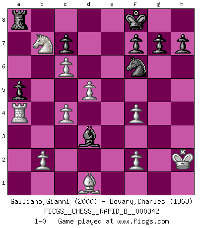 Last move : 1-0 2020 July 2 12:5:3 [Event "FICGS__CHESS__RAPID_B__000342"] [Site "FICGS"] [Date "2020.05.13"] [Round "1"] [White "Galliano,Gianni"] [Black "Bovary,Charles"] [Result "1-0"] [WhiteElo "2000"] [BlackElo "1963"] 1.e4 e5 2.Nf3 Nc6 3.Bb5 a6 4.Ba4 Nf6 5.O-O Be7 6.Re1 b5 7.Bb3 O-O 8.c3 d5 9.exd5 e4 10.dxc6 exf3 11.g3 Bg4 12.d4 Re8 13.Bf4 Bd6 14.Rxe8+ Nxe8 15.h3 Bxh3 16.Qxf3 Bxf4 17.Nd2 Qf6 18.Ne4 Qh6 19.Qxf4 Qxf4 20.gxf4 Bf5 21.Nc5 a5 22.a4 bxa4 23.Rxa4 Kf8 24.Nb7 Bd3 25.d5 Nf6 26.c4 Re8 27.Kh2 Ra8 28.Bd1 1-0 Ruy Lopez : Closed, 7...O-O Kingside Castling by player White (move 5) Kingside Castling by player Black (move 7) Player White won this chess game. Follow this game move after move (download)He who takes the Queen's Knight's Pawn will sleep in the streets. (Anonymous) Im Fernschach kannst du während dem Spiel rauchen. (John Christen Knudsen) Aquel que teme a un Peón de Reina aislado, debería de retirarse del Ajedrez. (Siegbert Tarrasch) Si le désir cupide (et stupide) de gagner est une inépuisable source de souffrance, une combinaison brillante sur l'échiquier est une découverte : le coquelicot qui s'épanouit lorsque apparaît la Voie Lactée. (Arrabal) The various flowers seem good to different people. (Chinese proverb)