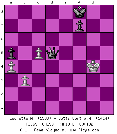 Last move : 0-1 2020 August 16 20:14:39 [Event "FICGS__CHESS__RAPID_D__000132"] [Site "FICGS"] [Date "2020.05.14"] [Round "1"] [White "Leurette,Marc-Antoine"] [Black "Dotti Contra,Alessandro"] [Result "0-1"] [WhiteElo "1599"] [BlackElo "1414"] 1.e4 e5 2.Nf3 Nc6 3.Bc4 Nf6 4.Ng5 d5 5.exd5 Na5 6.d3 Bb4+ 7.Bd2 Nxc4 8.dxc4 Bc5 9.Qe2 O-O 10.O-O Re8 11.Nc3 e4 12.Be3 Bd6 13.f3 exf3 14.Qxf3 Bg4 15.Qf2 Re5 16.h3 Bh5 17.Rae1 Qd7 18.Nf3 Bxf3 19.Qxf3 Rae8 20.Bf2 Rxe1 21.Rxe1 Rxe1+ 22.Bxe1 Bc5+ 23.Kf1 Bd4 24.b3 Qe7 25.Bh4 Bxc3 26.Qxc3 h6 27.Bxf6 gxf6 28.Qg3+ Kf8 29.a4 a5 30.Qe1 Qd6 31.Qd2 Kg7 32.Kf2 b6 33.g3 Qe5 34.Qf4 Qb2 35.Qe4 Qc3 36.h4 h5 37.g4 Qd2+ 38.Qe2 Qf4+ 39.Qf3 Qh2+ 40.Qg2 Qxh4+ 41.Qg3 Qxg4 42.Qxc7 h4 43.c3 Qd1 44.Qxb6 Qd2+ 45.Kf3 Qxc3+ 46.Qe3 Qc2 47.Kg4 Qh2 48.c5 f5+ 49.Kxf5 h3 50.Qg5+ Kf8 51.Qh6+ Ke7 52.Qe3+ Kf8 53.Kg4 Qg2+ 54.Kh4 h2 55.Qh3 h1Q 56.Qxh1 Qxh1+ 57.Kg4 Qxd5 0-1 Two knights defense : Kieseritsky variation Kingside Castling by player Black (move 9) Kingside Castling by player White (move 10) Promotion Queen by player Black (move 55) 10 pieces endgame at move 56 : White KQPPPP , Black KQPP WHITE : King + 1 Queen 4 Pawns BLACK : King + 1 Queen 2 Pawns 9 pieces endgame at move 56 : White KPPPP , Black KQPP WHITE : King + 4 Pawns BLACK : King + 1 Queen 2 Pawns 8 pieces endgame at move 57 : White KPPP , Black KQPP WHITE : King + 3 Pawns BLACK : King + 1 Queen 2 Pawns Player Black won this chess game. Follow this game move after move (download)One bad move nullifies forty good ones. (Horowitz) Der beste Spieler in einem Turnier gewinnt es nie. Er landet auf Platz zwei oder drei. (Siegbert Tarrasch) Una mala movida nulifica cuarenta buenas. (Horowitz) On entre au jeu d'Echecs comme on entre en Religion. Pour le joueur d'Echecs, la partie d'Echecs c'est l'office, la messe, le défilé du 1er Mai, le dépôt de gerbe au Monument aux Morts. C'est un drame sacré. (Michel Roos) Don't be irreplaceable, if you can't be replaced, you can't be promoted. (Dan Rotaru)