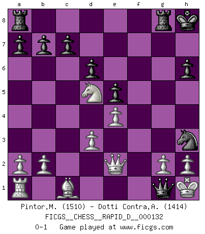 Last move : 0-1 2020 June 13 16:42:4 [Event "FICGS__CHESS__RAPID_D__000132"] [Site "FICGS"] [Date "2020.05.14"] [Round "1"] [White "Pintor,Manuel"] [Black "Dotti Contra,Alessandro"] [Result "0-1"] [WhiteElo "1510"] [BlackElo "1414"] 1.e4 e5 2.f4 Nc6 3.Nf3 d6 4.Bc4 Nf6 5.d3 Be7 6.Bxf7+ Kxf7 7.O-O h6 8.f5 g6 9.fxg6+ Kxg6 10.Nh4+ Kh7 11.Nf5 Bxf5 12.Rxf5 Rg8 13.Nc3 Nd4 14.Rf2 Ng4 15.Rf7+ Kh8 16.Nd5 Bh4 17.c3 Bf2+ 18.Rxf2 Qh4 19.cxd4 Qxf2+ 20.Kh1 Qxd4 21.Qe2 Nf2+ 22.Kg1 Nh3+ 23.Kh1 Qg1+ 0-1 King's gambit Kingside Castling by player White (move 7) Player Black won this chess game. Follow this game move after move (download)Chess is mental torture. (Garry Kasparov) Wir können eben der zündenden Macht des Opfers nicht wiederstehen, denn die Begeisterung für das Opfer liegt in der Natur des Menschen. (Rudolf Spielmann) Realmente no sabemos como el juego fue inventado, aunque hay sospechas. Tan pronto como descubramos a los culpables, se los haremos saber. (Bruce Pandolfini) Aux échecs, les retours au sommet sont rares : les dommages psychologiques consécutifs à une défaite sont trop sévères. (Daily Telegraph) There are lots of people who mistake their imagination for their memory. (Josh Bilings)