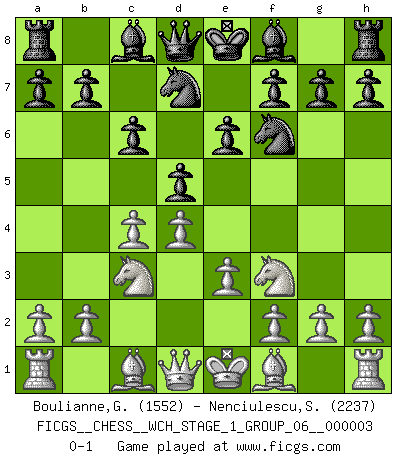 Last move : 0-1 2007 August 8 8:57:29 [Event "FICGS__CHESS__WCH_STAGE_1_GROUP_06__000003"] [Site "FICGS"] [Date "2007.07.11"] [Round "1"] [White "Boulianne,Gabriel"] [Black "Nenciulescu,Silviu"] [Result "0-1"] [WhiteElo "1552"] [BlackElo "2237"] 1.d4 d5 2.c4 c6 3.Nf3 Nf6 4.Nc3 e6 5.e3 Nbd7 0-1 QGD Slav : 4.Nc3 Player Black won this chess game. Follow this game move after move (download)It was clear to me that the vulnerable point of the American Grandmaster (Bobby Fischer) was in double-edged, hanging, irrational positions, where he often failed to find a win even in a won position. (Efim Geller) Das Schach hält seine Meister in eigenen Banden, Fesseln; auf vielerlei Weise formt es ihren Geist, so dass die innere Freiheit selbst des Stärksten beeinflusst wird. (Albert Einstein) Un jugador que trata de regresar una movida en el Ajedrez es un futuro carterista. (Richard Fenton) Horreur, mais aussi harmonie suprême : qu'y avait-il en effet au monde en dehors des échecs ? Le brouillard, l'inconnu, le non-être... (Vladimir Nabokov) The next best thing to gambling and winning is gambling and loosing. (Nick Dandalos)