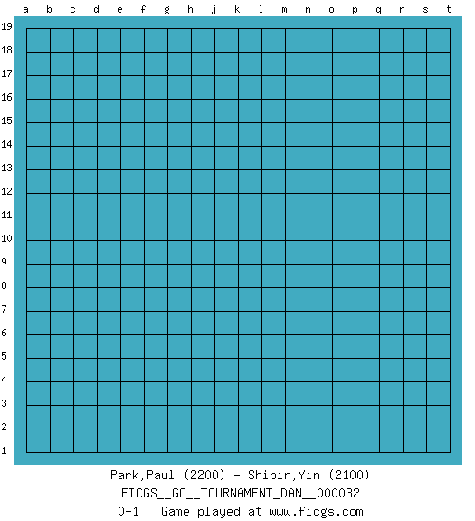 Last move : 0-1 2020 June 13 16:28:2 [Event "FICGS__GO__TOURNAMENT_DAN__000032"] [Site "FICGS"] [Date "2020.05.14"] [Round "1"] [Black "Park,Paul"] [White "Shibin,Yin"] [Result "0-1"] [Rating 1 "2200"] [Rating 2 "2100"] 0-1 This go game has been lost on time (started : 2020.05.14 14:25:37) Here are the names of the openings (joseki) played in the four corners : Player White won this Go (weiqi, baduk) game. Follow this game move after move (download)The carpenter's square becomes ko. (Anonymous) Whatever you do, don't be bored. This is absolutely the most exciting time we could have possibly hoped to be alive. And things are just starting. (From movie Waking life)