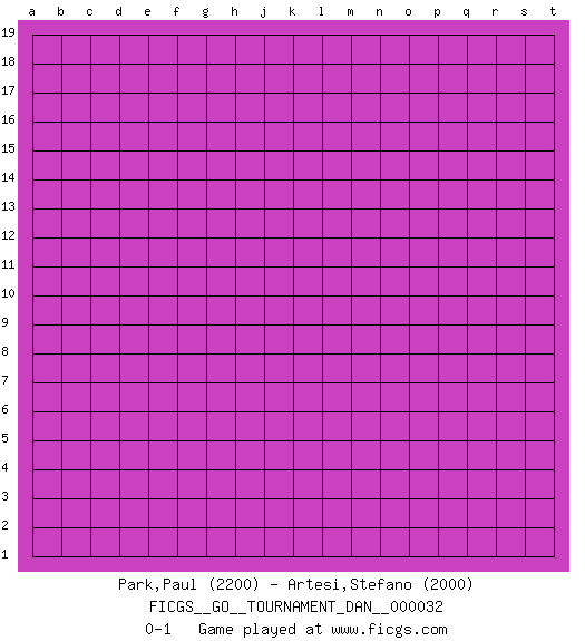 Last move : 0-1 2020 June 13 16:28:2 [Event "FICGS__GO__TOURNAMENT_DAN__000032"] [Site "FICGS"] [Date "2020.05.14"] [Round "1"] [Black "Park,Paul"] [White "Artesi,Stefano"] [Result "0-1"] [Rating 1 "2200"] [Rating 2 "2000"] 0-1 This go game has been lost on time (started : 2020.05.14 14:25:37) Here are the names of the openings (joseki) played in the four corners : Player White won this Go (weiqi, baduk) game. Follow this game move after move (download)Win the early ko to win the game. (Anonymous) A good teacher is like a candle - it consumes itself to light the way for others. (Author unknown)