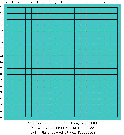 Last move : 0-1 2020 June 13 16:28:2 [Event "FICGS__GO__TOURNAMENT_DAN__000032"] [Site "FICGS"] [Date "2020.05.14"] [Round "1"] [Black "Park,Paul"] [White "Hao Kuan,Lin"] [Result "0-1"] [Rating 1 "2200"] [Rating 2 "2000"] 0-1 This go game has been lost on time (started : 2020.05.14 14:25:37) Here are the names of the openings (joseki) played in the four corners : Player White won this Go (weiqi, baduk) game. Follow this game move after move (download)Five liberties for tactical stability. (Anonymous) Good decisions come from experience, and experience comes from bad decisions. (Anonymous)