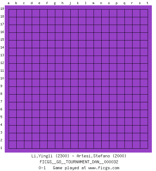 Last move : 0-1 2020 June 13 16:28:2 [Event "FICGS__GO__TOURNAMENT_DAN__000032"] [Site "FICGS"] [Date "2020.05.14"] [Round "1"] [Black "Li,Yingli"] [White "Artesi,Stefano"] [Result "0-1"] [Rating 1 "2300"] [Rating 2 "2000"] 0-1 This go game has been lost on time (started : 2020.05.14 14:25:37) Here are the names of the openings (joseki) played in the four corners : Player White won this Go (weiqi, baduk) game. Follow this game move after move (download)Attach to the strongest stone in a pincer. (Anonymous) Better than a thousand days of diligent study is one day with a great teacher. (Japanese proverb)