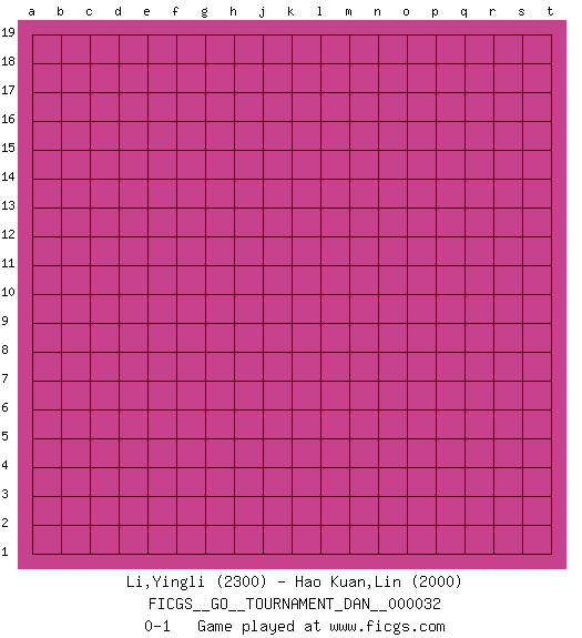 Last move : 0-1 2020 June 13 16:28:2 [Event "FICGS__GO__TOURNAMENT_DAN__000032"] [Site "FICGS"] [Date "2020.05.14"] [Round "1"] [Black "Li,Yingli"] [White "Hao Kuan,Lin"] [Result "0-1"] [Rating 1 "2300"] [Rating 2 "2000"] 0-1 This go game has been lost on time (started : 2020.05.14 14:25:37) Here are the names of the openings (joseki) played in the four corners : Player White won this Go (weiqi, baduk) game. Follow this game move after move (download)Conservative and slow will win. Believe it ! (Anonymous) SEO proverb : Make your website optimized for human beings, not for search engines.