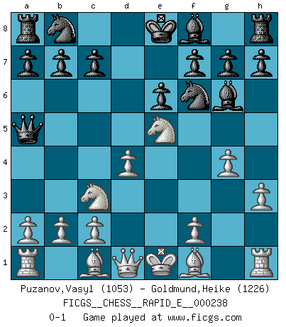 Last move : 0-1 2020 July 2 13:14:27 [Event "FICGS__CHESS__RAPID_E__000238"] [Site "FICGS"] [Date "2020.05.14"] [Round "1"] [White "Puzanov,Vasyl"] [Black "Goldmund,Heike"] [Result "0-1"] [WhiteElo "1053"] [BlackElo "1226"] 1.e4 d5 2.exd5 Qxd5 3.Nc3 Qa5 4.d4 Nf6 5.Nf3 Bg4 6.h3 Bf5 7.g4 Bg6 8.Ne5 e6 0-1 This chess game has been lost on time (started : 2020.05.14 14:30:10) Scandinavian defense, Lasker variation Player Black won this chess game. Follow this game move after move (download)If cunning alone were needed to excel, women would be the best Chess players. (Albin) Ich kämpfe solange mein Gegner einen Fehler machen kann. (Emanuel Lasker) El juego del Ajedrez no es solamente una diversión quieta; algunas cualidades muy valuables de la mente se pueden adquirir y cultivar con el, como convertirlos en habitos disponibles para toda ocasión; ya que la vida es algo así como el Ajedrez. (Benjamin Franklin) Il n'y a pas de prix trop élevé au scalp de l'ennemi. (Koblentz) I'm extremely disappointed. I send you out for exciting, new designer drugs, you come back with tomato sauce. (Gregory House, House M.D.)