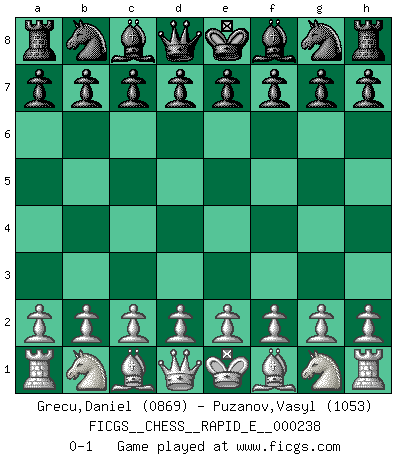 Last move : 0-1 2020 June 13 16:28:2 [Event "FICGS__CHESS__RAPID_E__000238"] [Site "FICGS"] [Date "2020.05.14"] [Round "1"] [White "Grecu,Daniel"] [Black "Puzanov,Vasyl"] [Result "0-1"] [WhiteElo "0869"] [BlackElo "1053"] 0-1 This chess game has been lost on time (started : 2020.05.14 14:30:10) Player Black won this chess game. Follow this game move after move (download)The beauty of a move lies not in its' appearance but in the thought behind it. (Siegbert Tarrasch) Ich habe kein Problem mit Frauen, sondern nur mit dem Niveau ihres Schachspiels (Judith Polgar) El juego de Fischer siempre fue nítido, racional y brillante. Uno de los mejores por siempre. (Dave Regis) Donnez-moi un Cavalier en 6e et je gagnerais toutes mes parties. (Steinitz) Always be a first-rate version of yourself, instead of a second-rate version of somebody else. (Judy Garland)