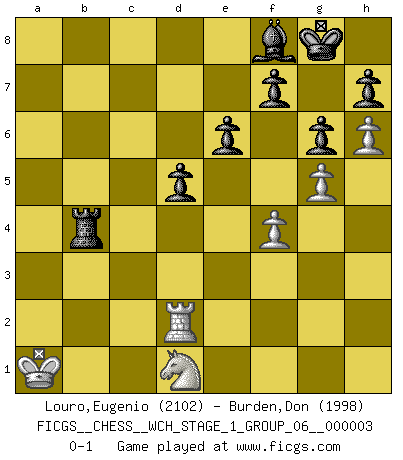 Last move : 0-1 2007 October 26 8:22:15 [Event "FICGS__CHESS__WCH_STAGE_1_GROUP_06__000003"] [Site "FICGS"] [Date "2007.07.11"] [Round "1"] [White "Louro,Eugenio"] [Black "Burden,Don"] [Result "0-1"] [WhiteElo "2102"] [BlackElo "1998"] 1.e4 c5 2.Nf3 d6 3.d4 cxd4 4.Nxd4 Nf6 5.Nc3 a6 6.Bg5 e6 7.f4 Be7 8.Qf3 Qc7 9.O-O-O Nbd7 10.g4 b5 11.Bxf6 Nxf6 12.g5 Nd7 13.a3 Rb8 14.h4 b4 15.axb4 Rxb4 16.Be2 Qb6 17.Nb3 Bb7 18.h5 O-O 19.h6 g6 20.Nd2 Rc8 21.b3 Qc7 22.Nc4 a5 23.Qe3 Nc5 24.Kb2 a4 25.Na2 Rxc4 26.Bxc4 Bxe4 27.Rhe1 axb3 28.Bxb3 Bf8 29.Nc3 d5 30.Rd4 Bf5 31.Ra1 Rb8 32.Rd2 Qb6 33.Nd1 Bxc2 34.Kxc2 Nxb3 35.Qxb6 Nxa1+ 36.Kb2 Rxb6+ 37.Kxa1 Rb4 0-1 This chess game has been lost on time (started : 2007.07.11 16:57:46) Sicilian : Najdorf, 7...Be7 Queenside Castling by player White (move 9) Kingside Castling by player Black (move 18) Player Black won this chess game. Follow this game move after move (download)I'm not afraid of Spassky. The world knows I'm the best. You don't need a match to prove it. (Bobby Fischer) Wenn es im Universum noch irgendwo intelligente Lebewesen gibt, dann kennen sie Go. (Emanuel Lasker) Los problemas de Ajedrez exigen del compositor las mismas virtudes que caracterizan todo el arte de valor: originalidad, invención, concisión, armonía, complejidad e insinceridad explendida. (Vladimir Nabokov) On est toujours la mazette de quelqu'un d'autre. (Anonyme) Have no fear of perfection - you'll never reach it. (Salvador Dali)