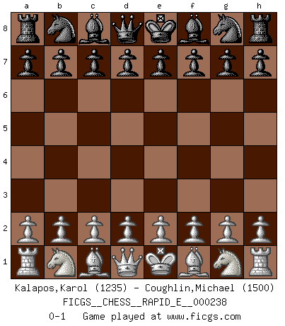Last move : 0-1 2020 June 13 16:28:2 [Event "FICGS__CHESS__RAPID_E__000238"] [Site "FICGS"] [Date "2020.05.14"] [Round "1"] [White "Kalapos,Karol"] [Black "Coughlin,Michael"] [Result "0-1"] [WhiteElo "1235"] [BlackElo "1500"] 0-1 This chess game has been lost on time (started : 2020.05.14 14:30:10) Player Black won this chess game. Follow this game move after move (download)You cannot play at Chess if you are kind-hearted. (French Proverb) Ein Springer auf f6 gegen die eigene Rochadestellung ist schlimmer als ein rostiger Nagel im Knie. (Efim Bogoljubov) Fischer deseaba darle a los Rusos una sopa de su propia medicina. (Larry Evans) Le moment que je préfère le plus dans une rencontre, c'est celui où je sens que la personnalité de l'adversaire se brise. (Robert Fischer) A government big enough to give you everything you want is strong enough to take everything you have. (Thomas Jefferson)
