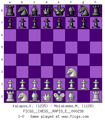 Last move : 1-0 2020 June 14 17:57:27 [Event "FICGS__CHESS__RAPID_E__000238"] [Site "FICGS"] [Date "2020.05.14"] [Round "1"] [White "Kalapos,Karol"] [Black "Molokomme,Mashilo Lawrence"] [Result "1-0"] [WhiteElo "1235"] [BlackElo "1128"] 1.Nf3 1-0 This chess game has been lost on time (started : 2020.05.14 14:30:10) Reti Opening Player White won this chess game. Follow this game move after move (download)Chess is a foolish expedient for making idle people believe they are doing something very clever when they are only wasting their time. (George Bernard Shaw) Schach ist das schnellste Spiel der Welt, weil man in jeder Sekunde Tausende von Gedanken ordnen muß. (Albert Einstein) La caracteristica mas importante en la posición del Ajedrez es la actividad de las piezas. Esto es absolutamente fundamental en todas las fases del juego: Apertura, Juego Medio y especialmente Finales. La limitación primordial en la actividad de una pieza, es la estructuración de los Peones. (Michael Stean) Le pion, dans sa simplicité, marche droit devant lui, mais lorsqu'il prend, il le fait obliquement? Ainsi l'homme, tant qu'il reste pauvre, marche dans la droiture et vit honnêtement, mais lorsqu'il recherche les honneurs, il flatte, se parjure et, par les voies obliques, cherche une position supérieure sur l'échiquier du monde. (Jean de Galles) We're missing something. (Gregory House, House M.D.)