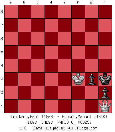Last move : 1-0 2020 August 1 19:49:39 [Event "FICGS__CHESS__RAPID_C__000237"] [Site "FICGS"] [Date "2020.05.18"] [Round "1"] [White "Quintero,Raul"] [Black "Pintor,Manuel"] [Result "1-0"] [WhiteElo "1863"] [BlackElo "1510"] 1.Nf3 Nc6 2.d4 d5 3.Bf4 Nf6 4.e3 Bg4 5.Be2 e6 6.h3 Bh5 7.Nbd2 Ne4 8.c3 Be7 9.Ne5 Bxe2 10.Qxe2 O-O 11.Nxc6 bxc6 12.Nxe4 dxe4 13.O-O f5 14.Qc4 Qd7 15.f3 exf3 16.Rxf3 Rf6 17.Re1 Rb8 18.b3 Rg6 19.e4 fxe4 20.Rxe4 Rb5 21.Be5 c5 22.a4 Ra5 23.Ref4 h5 24.Kf1 c6 25.Qd3 Qe8 26.Re4 cxd4 27.cxd4 Rd5 28.Qa6 Qd7 29.Kg1 Bf6 30.Qc4 Bxe5 31.dxe5 Rd1+ 32.Rf1 Qd2 33.Qe2 Rxf1+ 34.Qxf1 Qd5 35.Qf3 h4 36.Rf4 Qxf3 37.Rxf3 Rg5 38.Re3 Kf7 39.Kf2 Kg6 40.Re4 Rf5+ 41.Ke2 Kh5 42.Kd3 g5 43.Kd4 Rf2 44.Rg4 Kg6 45.Kc5 Rc2+ 46.Kd6 Kf5 47.b4 Re2 48.Kxc6 Rxe5 49.Kb7 a5 50.b5 Re2 51.b6 e5 52.Ka7 e4 53.b7 Rb2 54.b8Q Rxb8 55.Kxb8 e3 56.Rc4 Ke5 57.Kb7 Kd5 58.Rc1 Kd4 59.Kb6 Kd3 60.Kxa5 Kd2 61.Ra1 e2 62.Kb4 e1Q 63.Rxe1 Kxe1 64.a5 Kf2 65.a6 Kxg2 66.a7 Kxh3 67.a8Q g4 68.Qh1+ Kg3 69.Kc4 h3 70.Kd4 h2 71.Ke3 Kh3 72.Kf4 g3 73.Kf3 1-0 Reti Opening Kingside Castling by player Black (move 10) Kingside Castling by player White (move 13) Promotion Queen by player White (move 54) 10 pieces endgame at move 55 : White KRPPP , Black KPPPP WHITE : King + 1 Rook 3 Pawns BLACK : King + 4 Pawns 9 pieces endgame at move 60 : White KRPPP , Black KPPP WHITE : King + 1 Rook 3 Pawns BLACK : King + 3 Pawns Promotion Queen by player Black (move 62) 8 pieces endgame at move 63 : White KRPPP , Black KPP WHITE : King + 1 Rook 3 Pawns BLACK : King + 2 Pawns 7 pieces endgame at move 63 : White KPPP , Black KPP WHITE : King + 3 Pawns BLACK : King + 2 Pawns 6 pieces endgame at move 65 : White KPP , Black KPP WHITE : King + 2 Pawns BLACK : King + 2 Pawns 5 pieces endgame at move 66 : White KP , Black KPP WHITE : King + 1 Pawn BLACK : King + 2 Pawns Promotion Queen by player White (move 67) Player White won this chess game. Follow this game move after move (download)Chess is as much a mystery as women. (Purdy) Die meiste Zeit treffe ich auf Gegner, die meine Enkel sein könnten. Ich bin da, um ihnen zu zeigen, dass sie von mir noch einiges lernen können. (Viktor Kortschnoi) Combinaciones deslumbrantes son para la mayoría, mover madera es para los pocos. (Georg Kieninger) On a dit que l'homme se distingue de l'animal par le fait qu'il achète plus de livres qu'il ne peut en lire. Je voudrais suggérer qu'inclure à la liste des livres quelques livres d'échecs rendrait la distinction manifeste. (Edward Lasker) Now you put water in a cup, it becomes the cup; You put water into a bottle it becomes the bottle; You put it in a teapot it becomes the teapot. Water can flow or it can crash. Be water, my friend. (Bruce Lee)